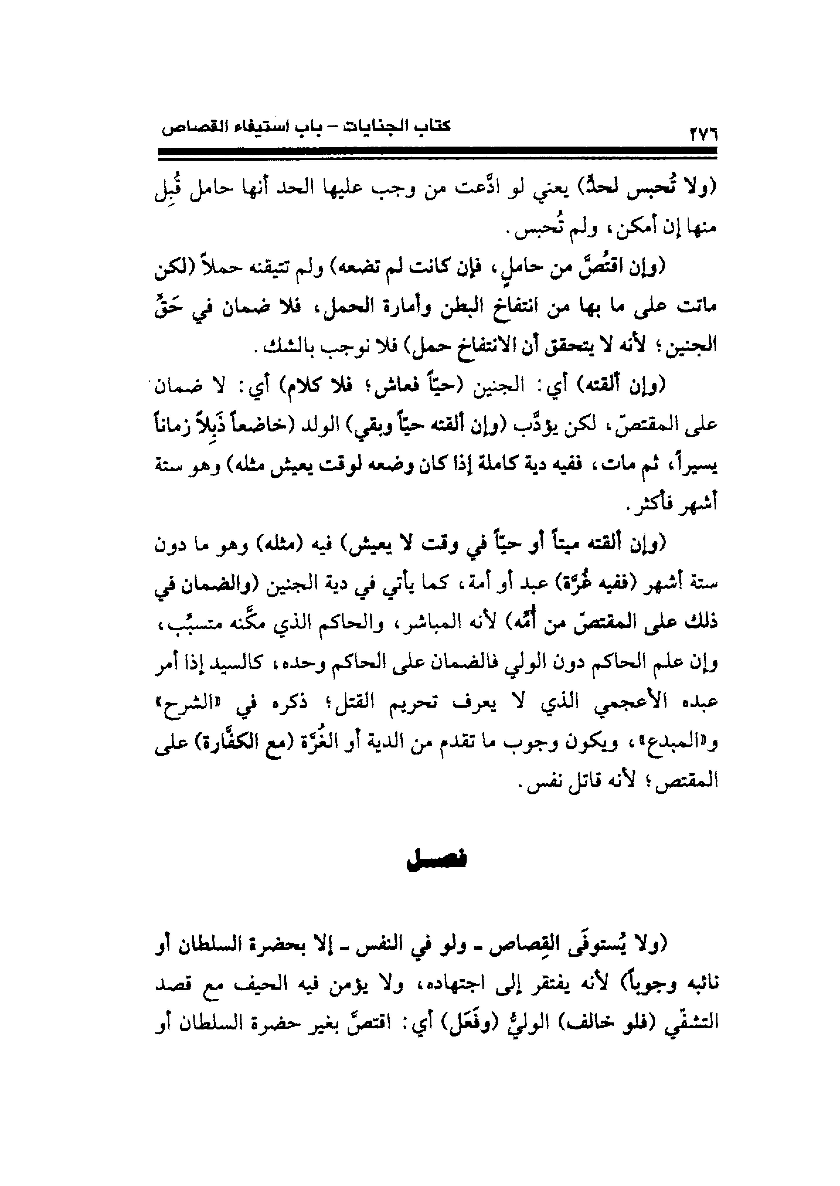 (ولا يستوفَى القصاص -ولو في النفس- إلا بحضرة السلطان أو نائبه وجوبًا) لأنه يفتقر إلى اجتهاده، ولا يؤمن فيه الحيف مع قصد التشفّى (فلو خالف) الولي (وفَعَل) أى: اقتصَّ بغير حضرة السلطان أو