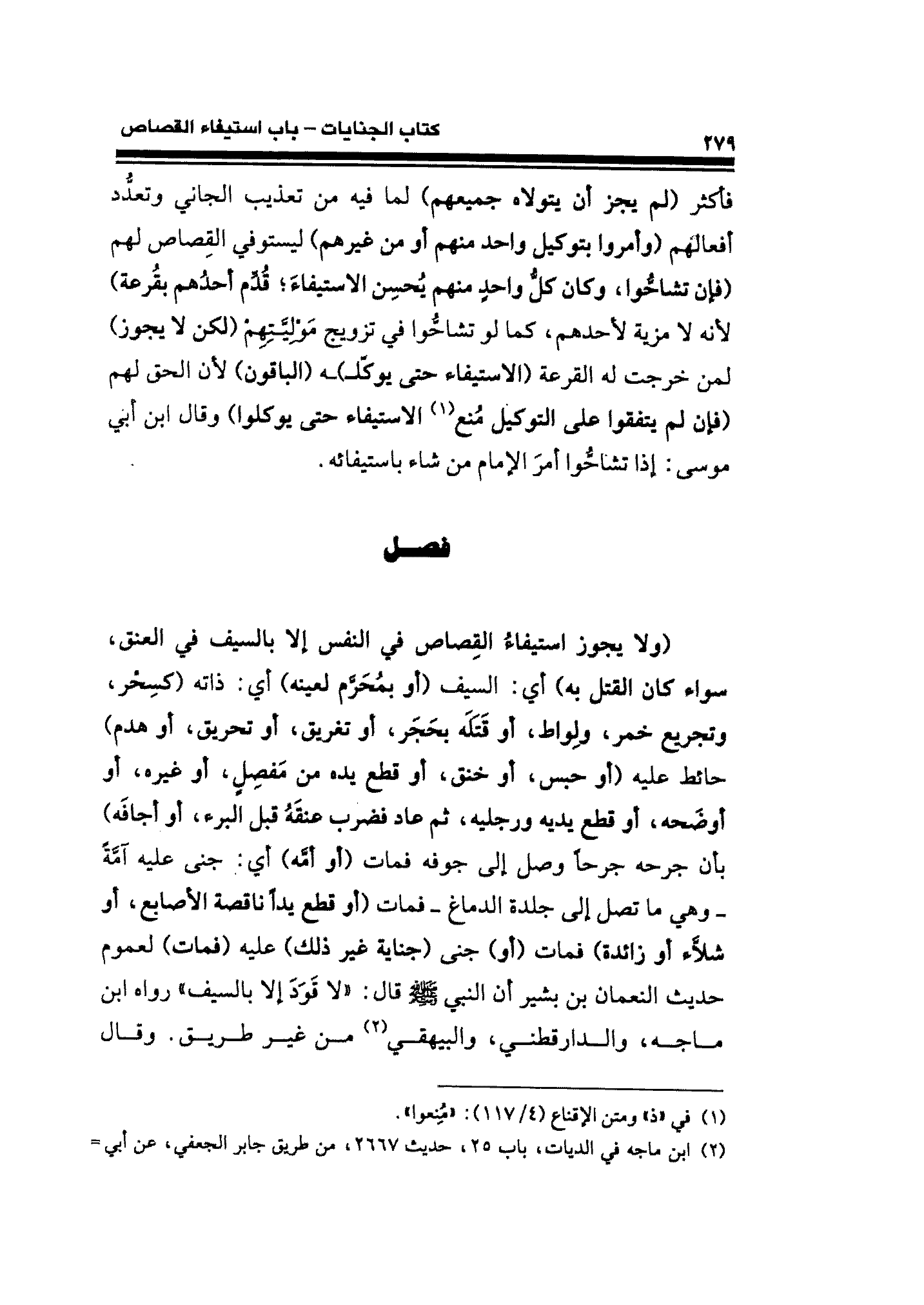 (ولا يجوز استيفاءُ القِصاص في النفس إلا بالسيف في العنق، سواء كان القتل به) أي: السيف (أو بمُحرم لعينه) أي: ذاته (كسِحر، وتجريع خمر، ولِواط، أو قَتله بحَجَر، أو تغريق، أو تحريق، أو هدم) حائط عليه (أو حبس، أو خنق، أو قطع يده من مفصل، أو غيره، أو أوضَحه، أو قطع يديه ورجليه، ثم عاد فضرب عنقَهُ قبل البرء، أو أجافَه) بأن جرحه جرحًا وصل إلى جوفه فمات (أو أمه) أي: جنى عليه آمة -وهى ما تصل إلى جلدة الدماغ- فمات (أو قطع يدًا ناقصة الأصابع، أو شلاء أو زائدة) فمات (أو) جنى (جناية غير ذلك) عليه (فمات) لعموم حديث النعمان بن بشير أن النبي - صلى الله عليه وسلم - قال: "لا قَوَدَ إلا بالسيف" رواه ابن ماجه، والدارقطني، والبيهقي (¬٢) من غير طريق. وقال
