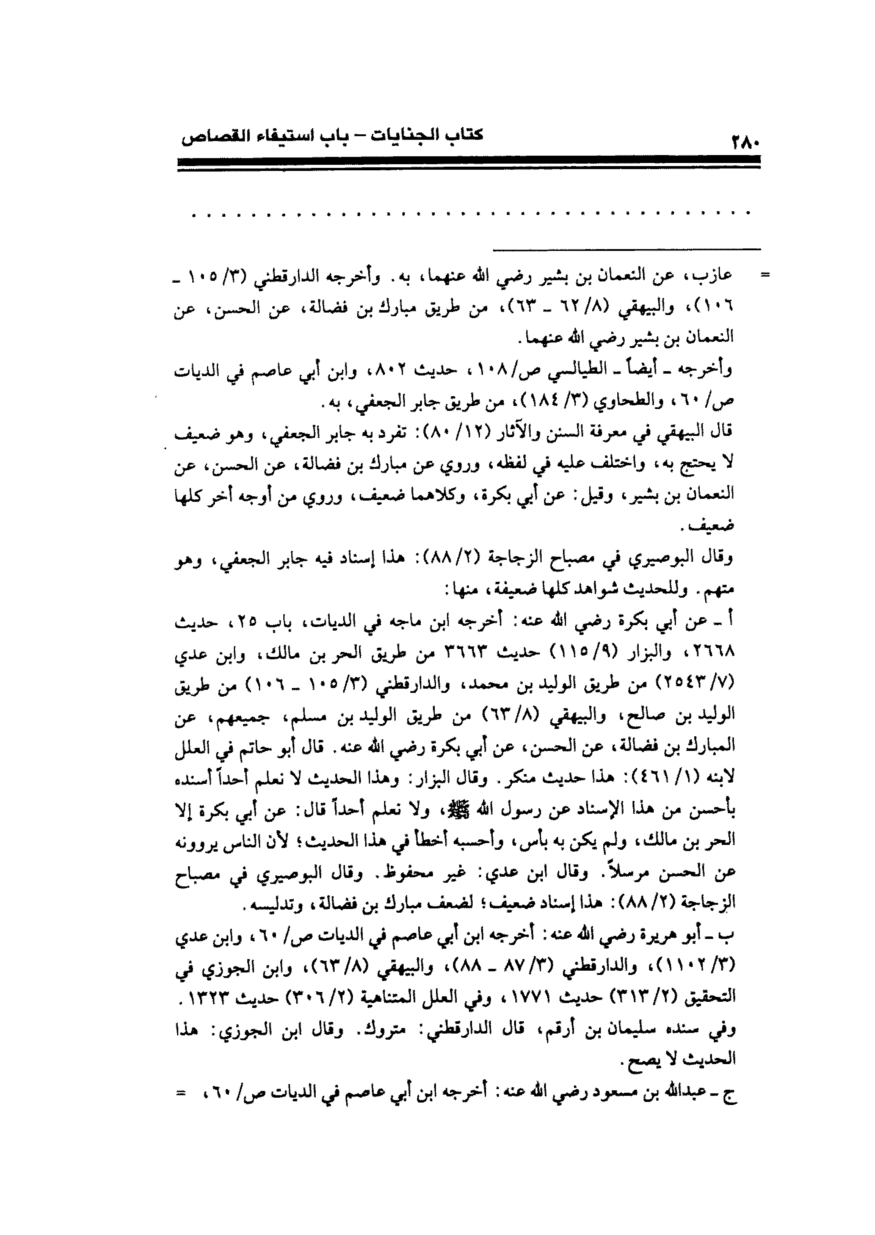 أ - عن أبى بكرة -رضي الله عنه-: أخرجه ابن ماجه فى الديات، باب ٢٥، حديث ٢٦٦٨، والبزار (٩/ ١١٥) حديث ٣٦٦٣ من طريق الحر بن مالك، وابن عدى (٧/ ٢٥٤٣) من طريق الوليد بن محمد، والدارقطنى (٣/ ١٠٥ - ١٠٦) من طريق الوليد بن صالح، والبيهقى (٨/ ٦٣) من طريق الوليد بن مسلم، جميعهم، عن المبارك بن فضالة، عن الحسن، عن أبى بكرة -رضي الله عنه-. قال أبو حاتم فى العلل لابنه (١/ ٤٦١): هذا حديث منكر. وقال البزار: وهذا الحديث لا نعلم أحدًا أسنده بأحسن من هذا الإسناد عن رسول الله - صلى الله عليه وسلم -، ولا نعلم أحدًا قال: عن أبى بكرة إلا الحر بن مالك، ولم يكن به بأس، وأحسبه أخطأ فى الحديث؛ لأن الناس يروونه عن الحسن مرسلًا. وقال ابن عدى: غير محفوظ. وقال البوصيرى فى مصباح الزجاجة (٢/ ٨٨): هذا إسناد ضعيف؛ لضعف مبارك بن فضالة، وتدليسه.