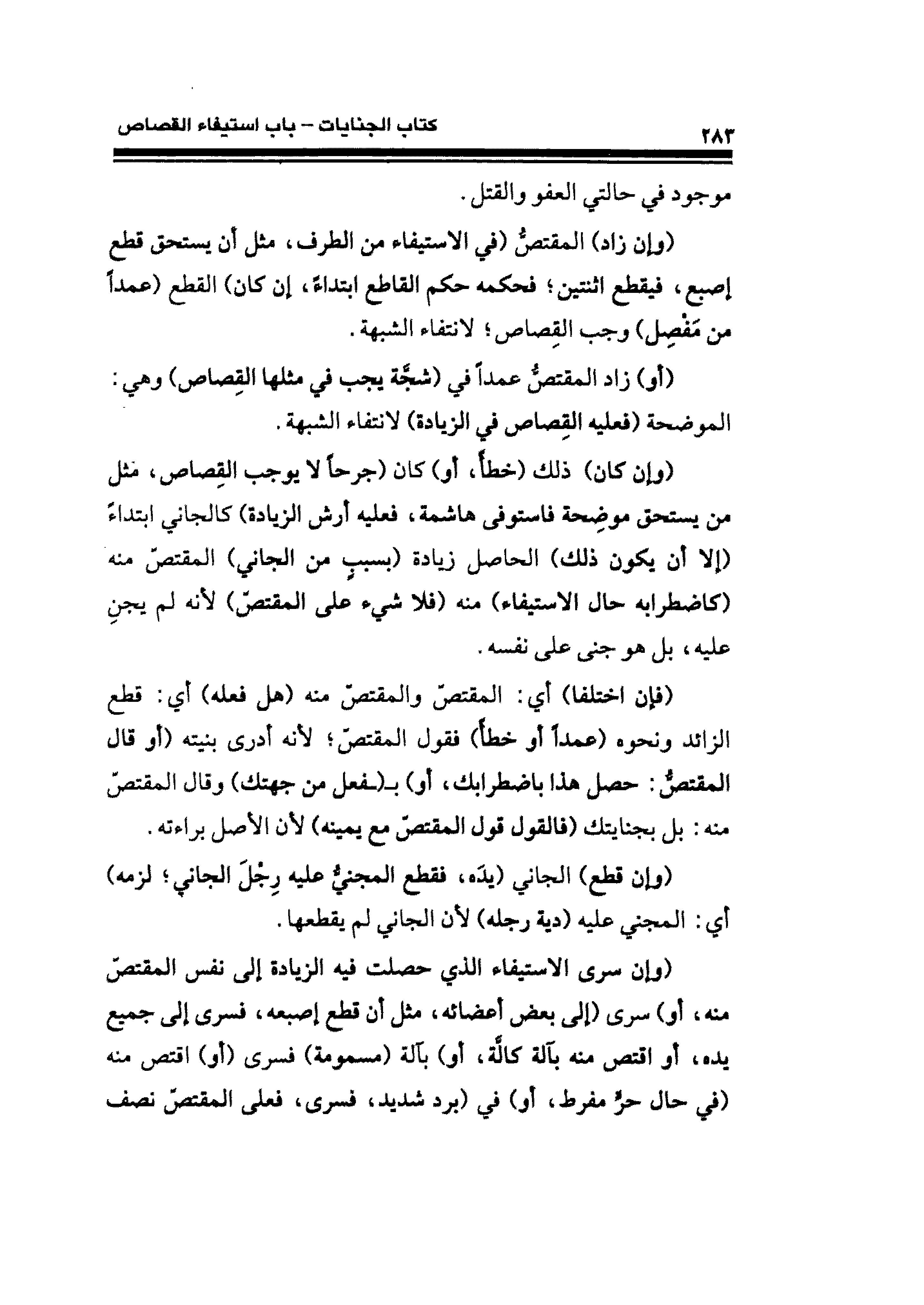 (وإن زاد) المقتصُّ (فى الاستيفاء من الطرف، مثل أن يستحق قطع إصبع، فيقطع اثنين؛ فحكمه حكم القاطع ابتداءً، إن كان) القطع (عمدًا من مَفصِل) وجب القِصاص؛ لانتفاء الشبهة.