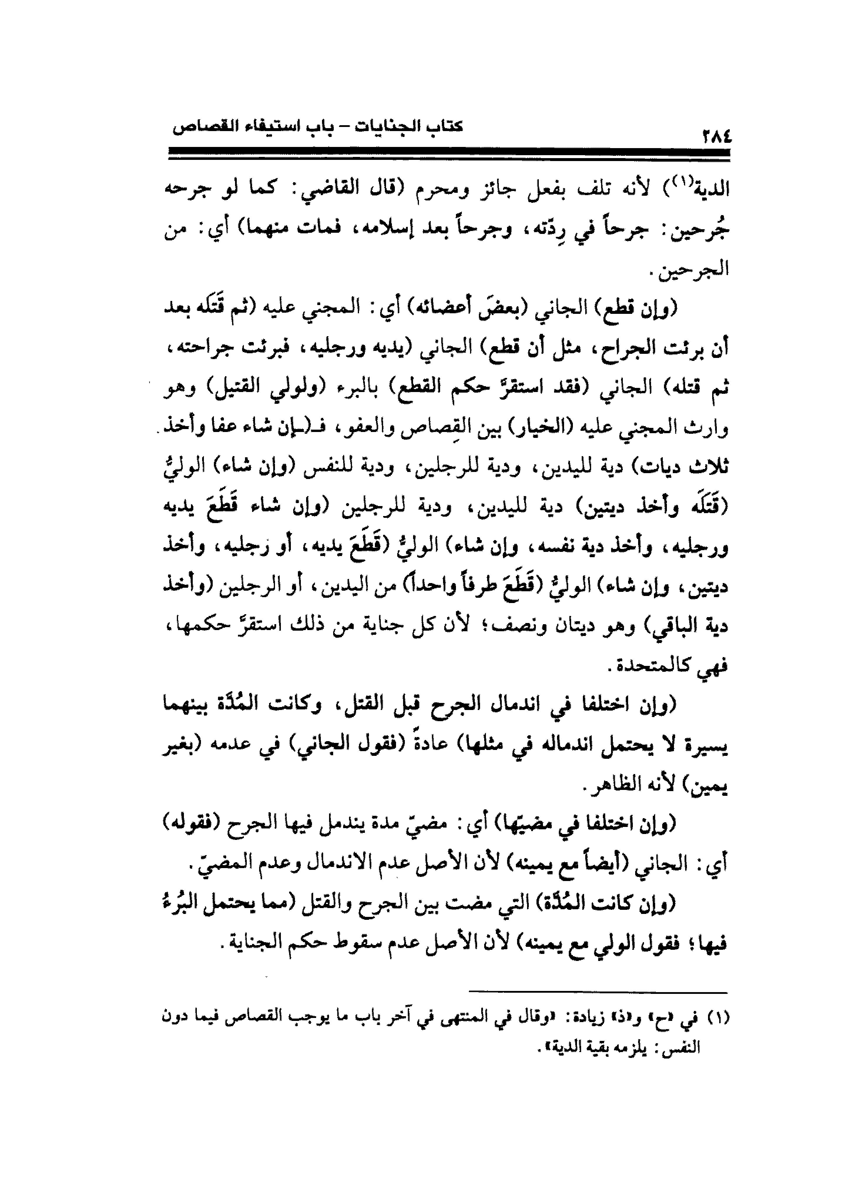 (وإن قطع) الجاني (بعضَ أعضائه) أي: المجني عليه (ثم قَتَله بعد أن برئت الجراح، مثل أن قطع) الجاني (يديه ورجليه، فبرئت جراحته، ثم قتله) الجاني (فقد استقر حكم القطع بالبرء (ولولي القتيل وهو وارث المجني عليه (الخيار) بين القِصاص والعفو، فـ (إن شاء عفا وأخذ ثلاث ديات) دية لليدين، ودية للرجلين، ودية للنفس (وإن شاء) الولىُّ (قَتَلَه وأخذ ديتين) دية لليدين، ودية للرجلين (وإن شاء قَطَعَ يديه ورجليه، وأخذ دية نفسه، وإن شاء) الولىُّ قَطَعَ يديه، أو رجليه، وأخذ ديتين، وإن شاء) الولىُّ (قَطَعَ طرفًا واحدًا) من اليدين، أو الرجلين (وأخذ دية الباقي) وهو ديتان ونصف؛ لأن كل جناية من ذلك استقَّ حكمها، فهي كالمتحدة.