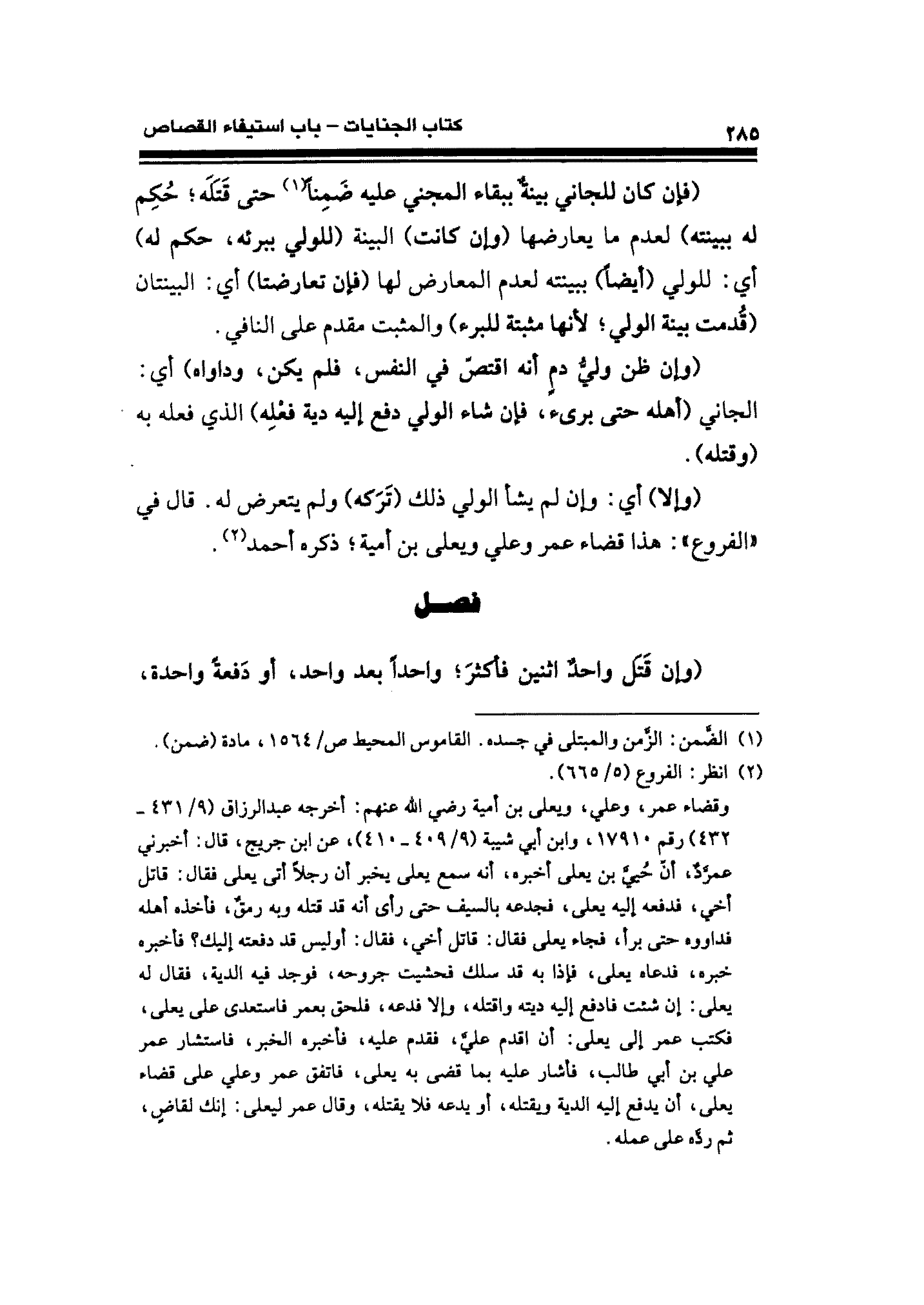 وقضاء عمر، وعلي، ويعلى بن أمية -رضي الله عنهم-: أخرجه عبد الرزاق (٩/ ٤٣١ - ٤٣٢) رقم ١٧٩١٠، وابن أبى شيبة (٩/ ٤٠٩ - ٤١٠)، عن ابن جريج، قال: أخبرنى عمرَّدٌ، أن حُيىِّ بن يعلى أخبره، أنه سمع يعلى يخبر أن وجلًا أتى يعلى فقال: قاتل أخي، فدفعه إليه يعلى، فجدعه بالسيف حتى رأى أنه قد قتله وبه رمقٌ، فأخذه أهله فداووه حتى برأ، فجاء يعلى فقال: قاتل أخي، فقال: أوليس قد دفعته إليك؟ فأخبره خبره، فدعاه يعلى، فإذا به قد سلك فحشيت جروحه، فوجد فيه الدية، فقال له يعلى: إن شئت فادفع إليه ديته واقتله، وإلا فدعه، فلحق بعمر فاستعدى على يعلى، فكتب عمر إلى يعلى: أن أقدم عليَّ، فقدم عليه، فأخبره الخبر، فاستشار عمر علي بن أبى طالب، فأشار عليه بما قضى به يعلى، فاتفق عمر وعلي على قضاء يعلى، أن يدفع اليه الدية ويقتله، أو يدعه فلا يقتله، وقال عمر ليعلى: إنك لقاضٍ، ثم رده إلى عمله.