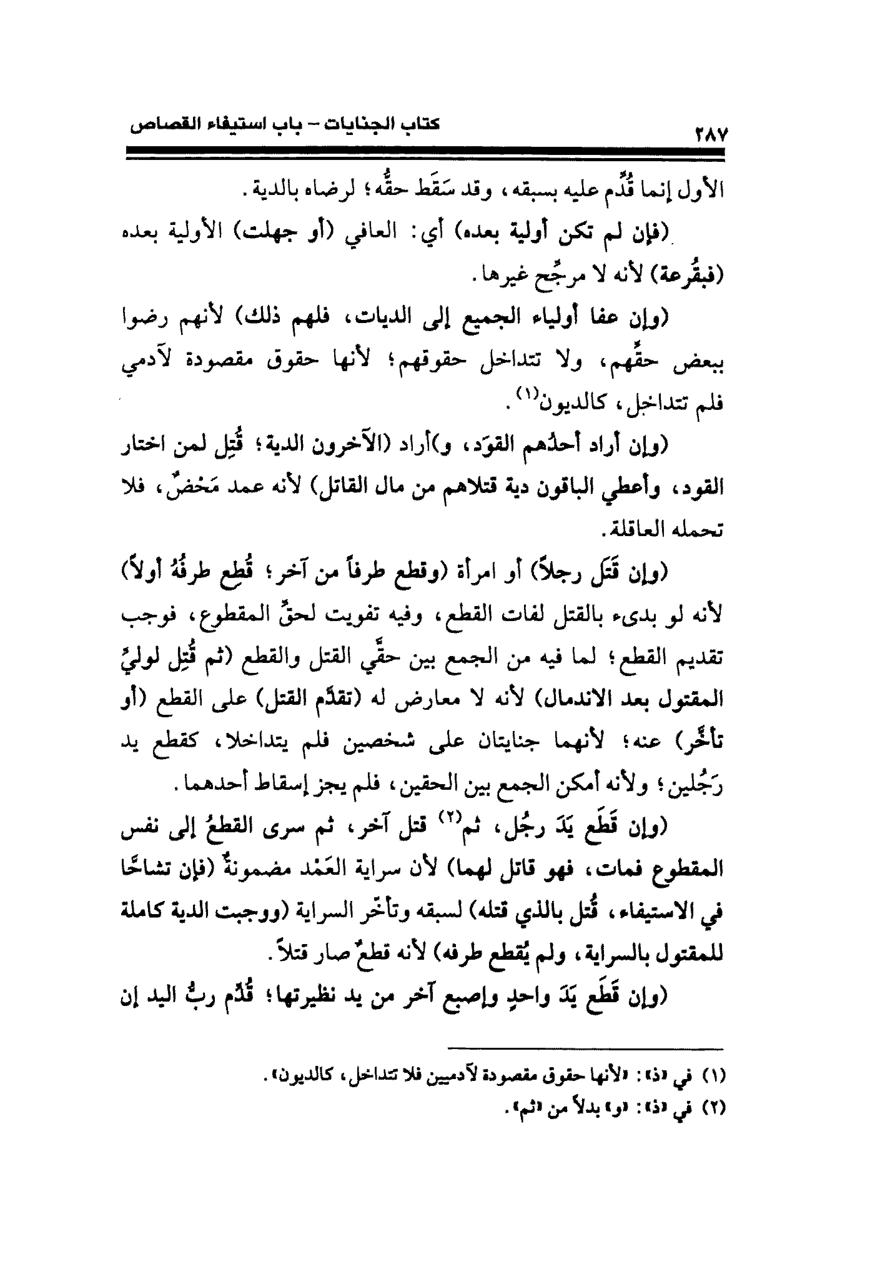 (وإن قَتَل رجلًا) أو امرأة (وقطع طرفًا من آخر؛ قُطِع طرفُهُ أولًا) لأنه لو بدئ بالقتل لفات القطع، وفيه تفويت لحقِّ المقطوع، فوجب تقديم القطع؛ لما فيه من الجمع بين حقِّي القتل والقطع (ثم قُتِل لولىِّ المقتول بعد الاندمال) لأنه لا معارض له (تقدَّم للقتل) على القطع (أو تأخَّر) عنه؛ لأنهما جنايتان على شخصين فلم يتداخلا، كقطع يد رَجُلين؛ ولأنه أمكن الجمع بين الحقين، فلم يجز إسقاط أحدهما.