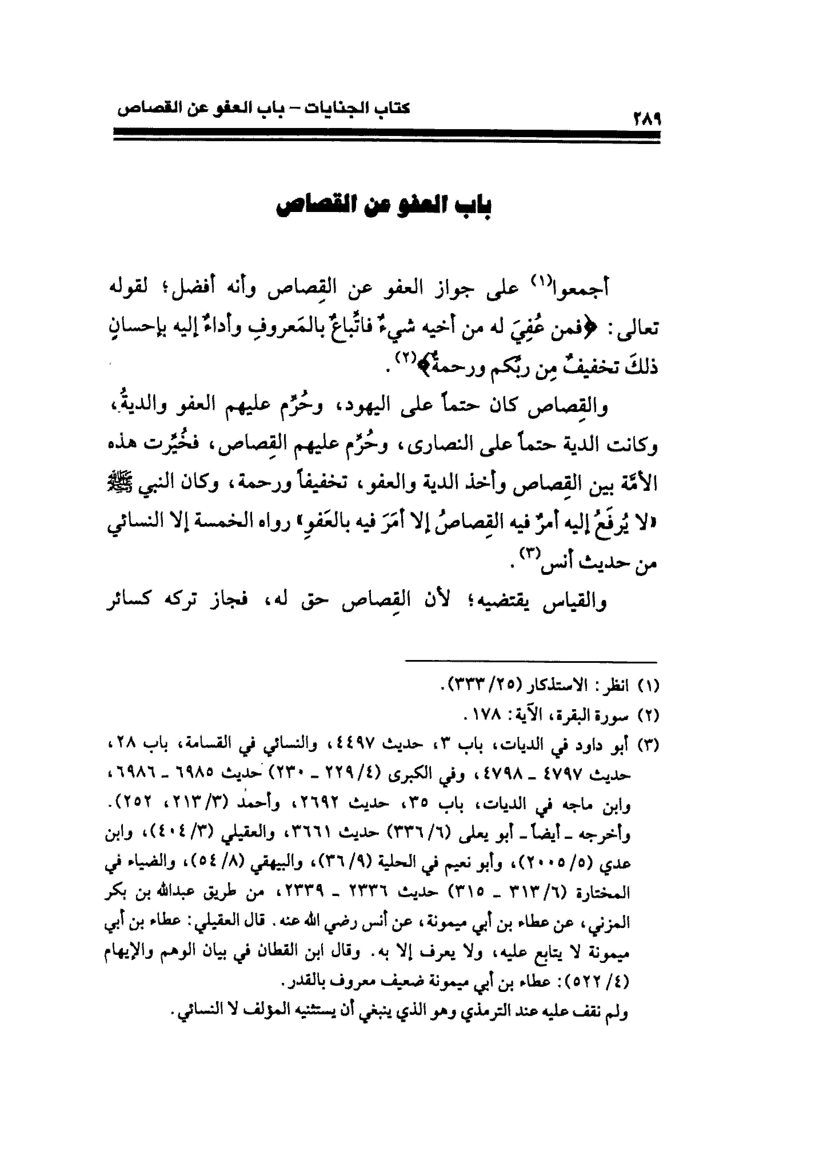 (¬٣) أبو داود فى الديات، باب ٣، حديث ٤٤٩٧، والنسائي في القسامة، باب ٢٨، حديث ٤٧٩٧ - ٤٧٩٨، وفي الكبرى (٤/ ٢٢٩ - ٢٣٠) حديث ٦٩٨٥ - ٦٩٨٦، وابن ماجه في الديات، باب ٣٥، حديث ٢٦٩٢، وأحمد ١٣/ ٢١٣، ٢٥٢). وأخرجه -أيضًا- أبو يعلى (٦/ ٣٣٦) حديث ٣٦٦١، والعقيلي (٣/ ٤٠٤)، وابن عدى (٥/ ٣٠٠٥)، وأبو نعيم فى الحلية (٩/ ٣٦). والبيهقي (٨/ ٥٤)، والضياء في المختارة (٦/ ٣١٣ - ٣١٥) حديث ٢٣٣٦ - ٢٣٣٩، من طريق عبد الله بن بكر المزني، عن عطاء بن أبي ميمونة، عن أنس -رضي الله عنه-. قال العقيلي؛ عطاء بن أبي ميمونة لا يتابع عليه، ولا يعرف إلا به. وقال ابن القطان فى بيان الوهم والإيهام (٤/ ٥٢٢): عطاء بن أبى ميمونة ضعيف معروف بالقدر.