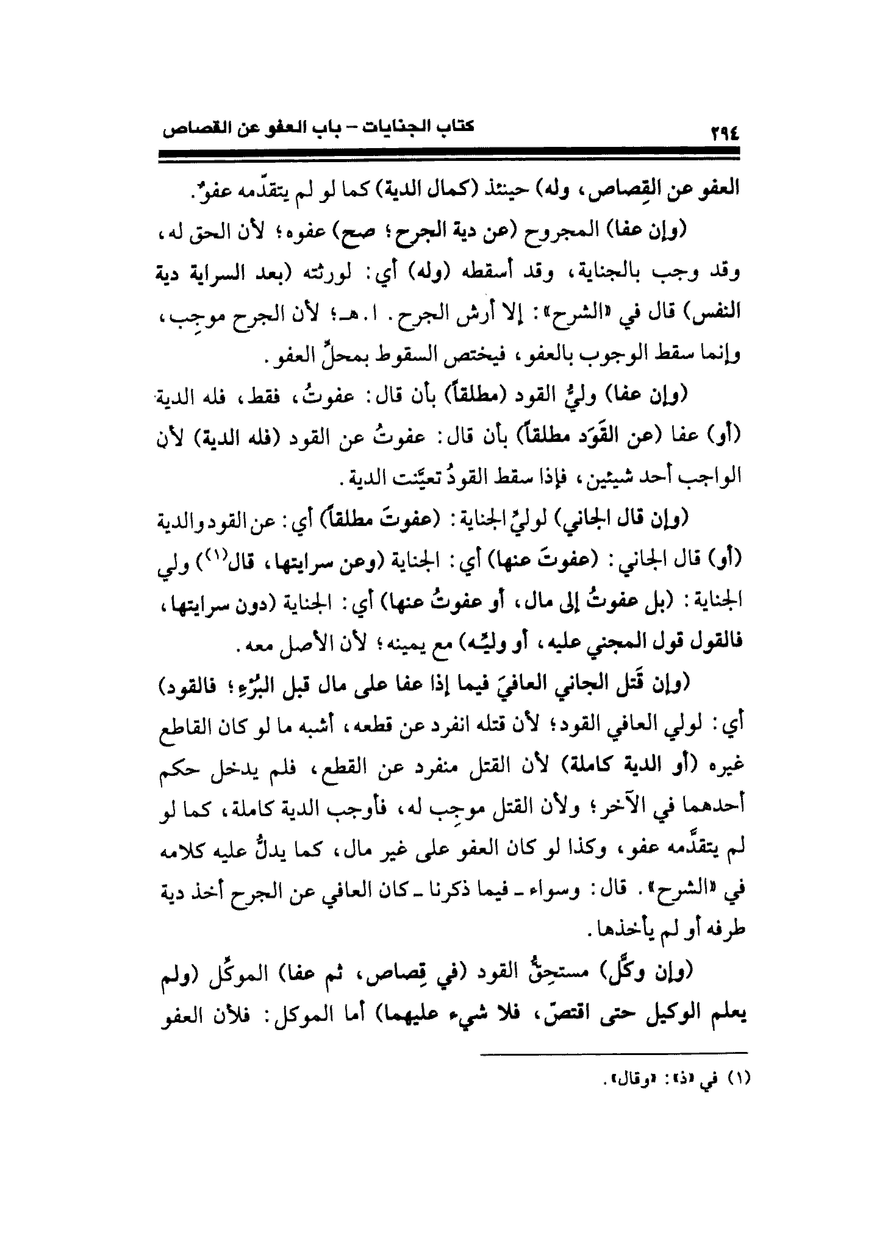 (وإن عفا) المجروح (عن دية الجرح؛ صح) عفوه؛ لأن الحق له، وقد وجب بالجناية، وقد أسقطه (وله) أي: لورثته (بعد السراية دية النفس) قال في "الشرح": إلا أرش الجرح. ا. هـ؛ لأن الجرح موجِب، وإنما سقط الوجوب بالعفو، فيختص السقوط بمحلِّ العفو.