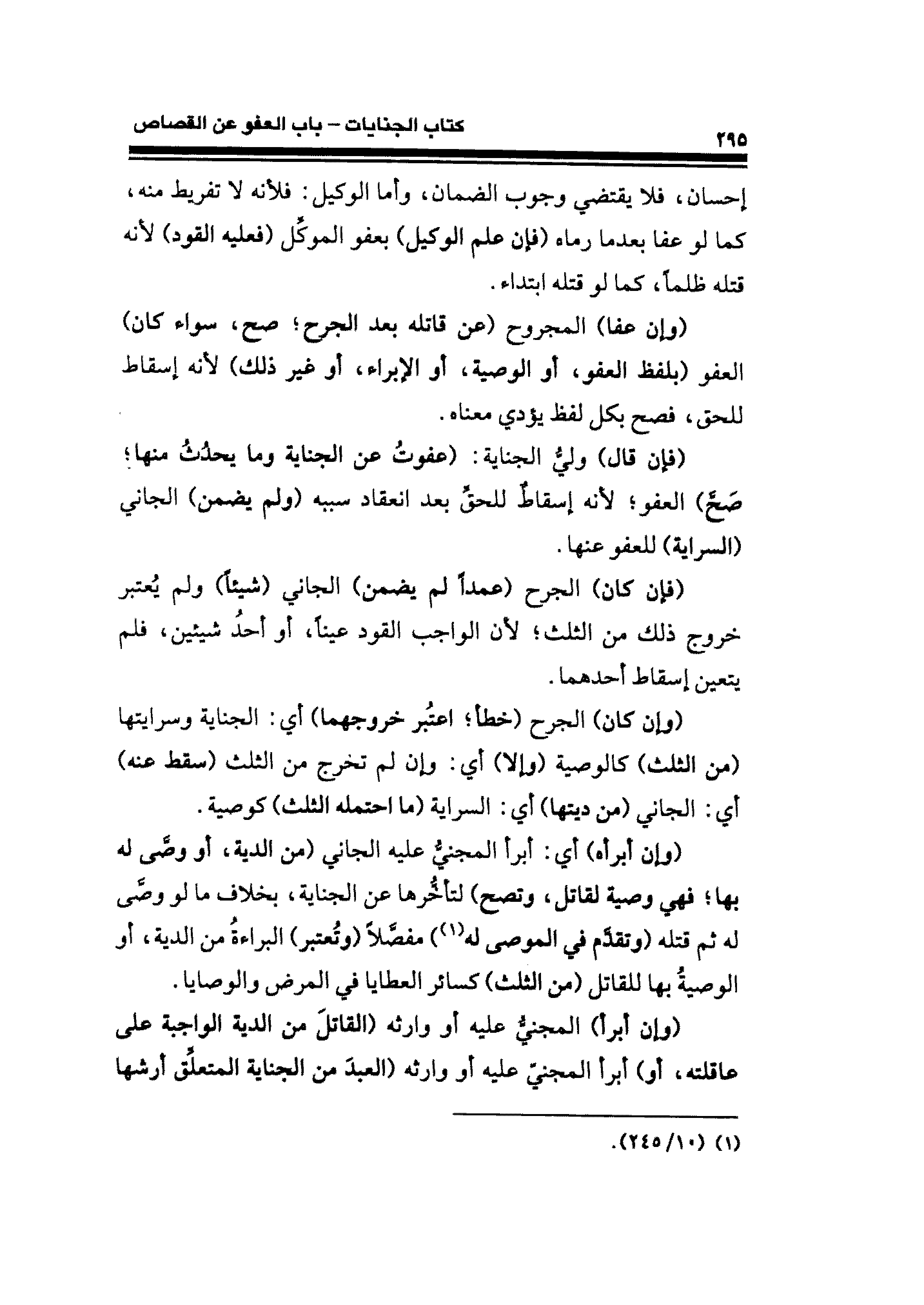 (فإن قال) وليُّ الجناية: (عفوتُ عن الجنابة وما يحدُثُ منها؛ صَحَّ) العفو؛ لأنه إسقاط للحق بعد انعقاد سببه (ولم يضمن) الجاني (السراية) للعفو عنها.