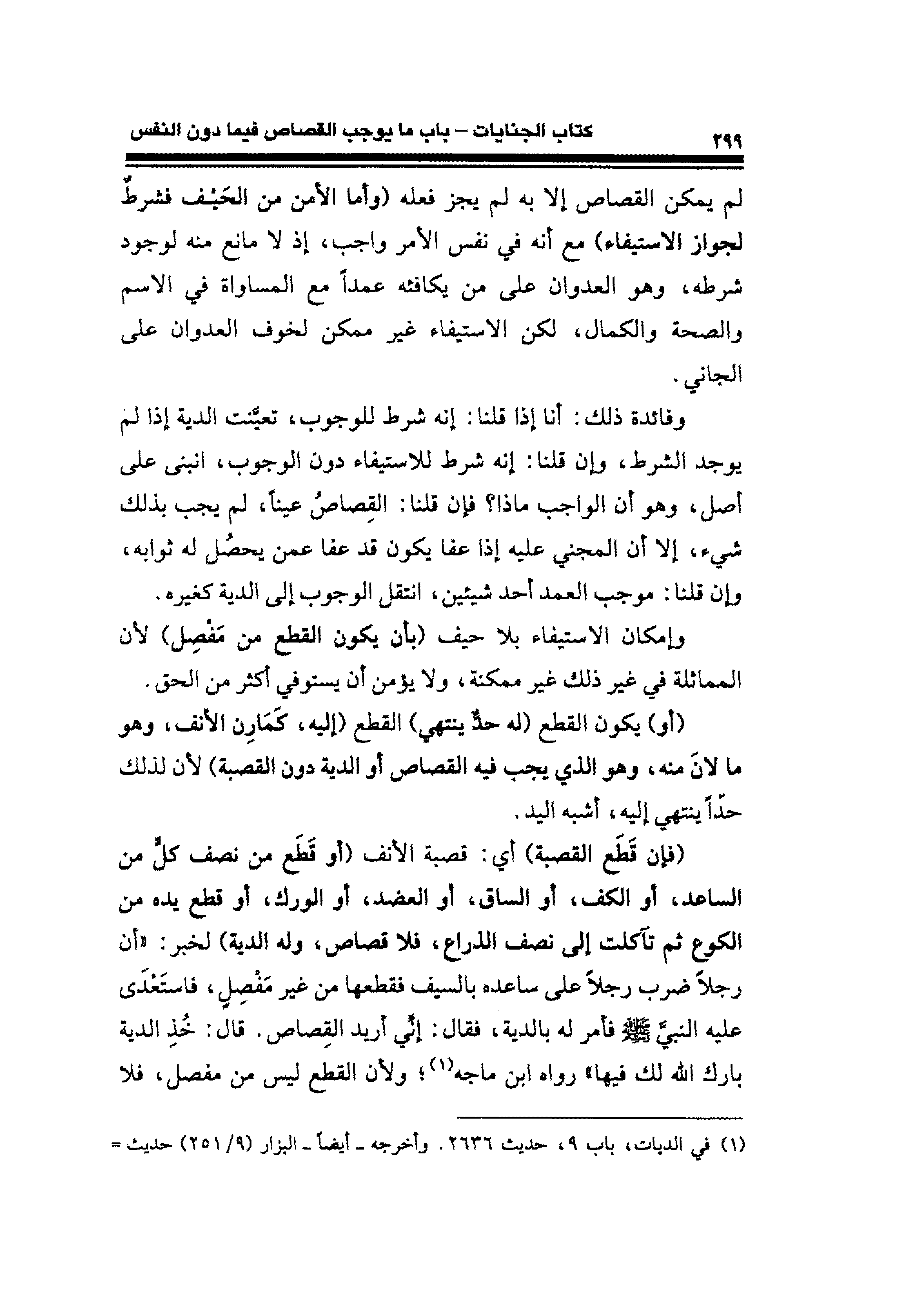 وإمكان الاستيفاء بلا حيف (بأن يكون القطع من مفْصِل) لأن المماثلة في غير ذلك غير ممكنة، ولا يؤمن أن يستوفي أكثر من الحق.