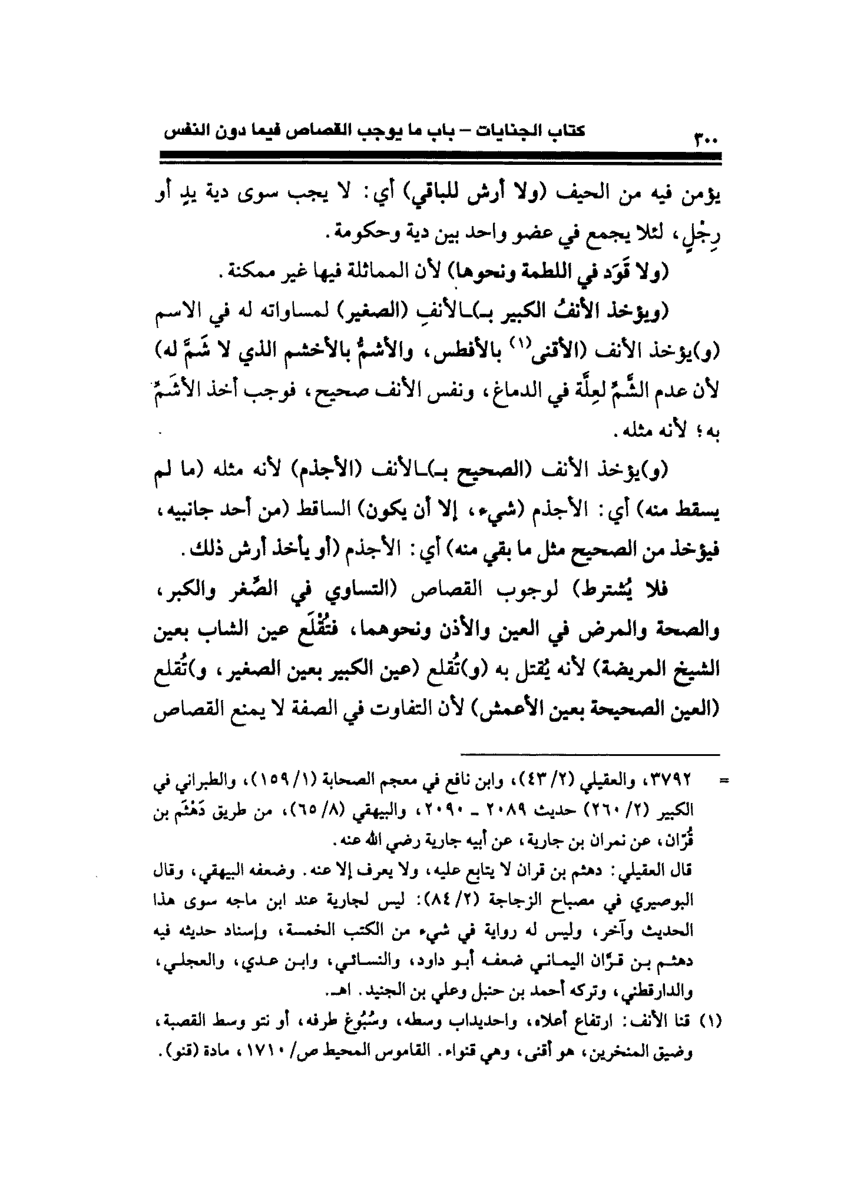 (ويؤخذ الأنفُ الكبير بـ) ـالأنفِ (الصغير) لمساواته له فى الاسم (و) يؤخذ الأنف (الأقني (¬١) بالأفطس، والأشمُّ بالأخشم الذي لا شَمَّ له) لأن عدم الشَّمِّ لعِلَّة في الدماغ، ونفس الأنف صحيح، فوجب أخذ الأشَمِّ به؛ لأنه مثله.