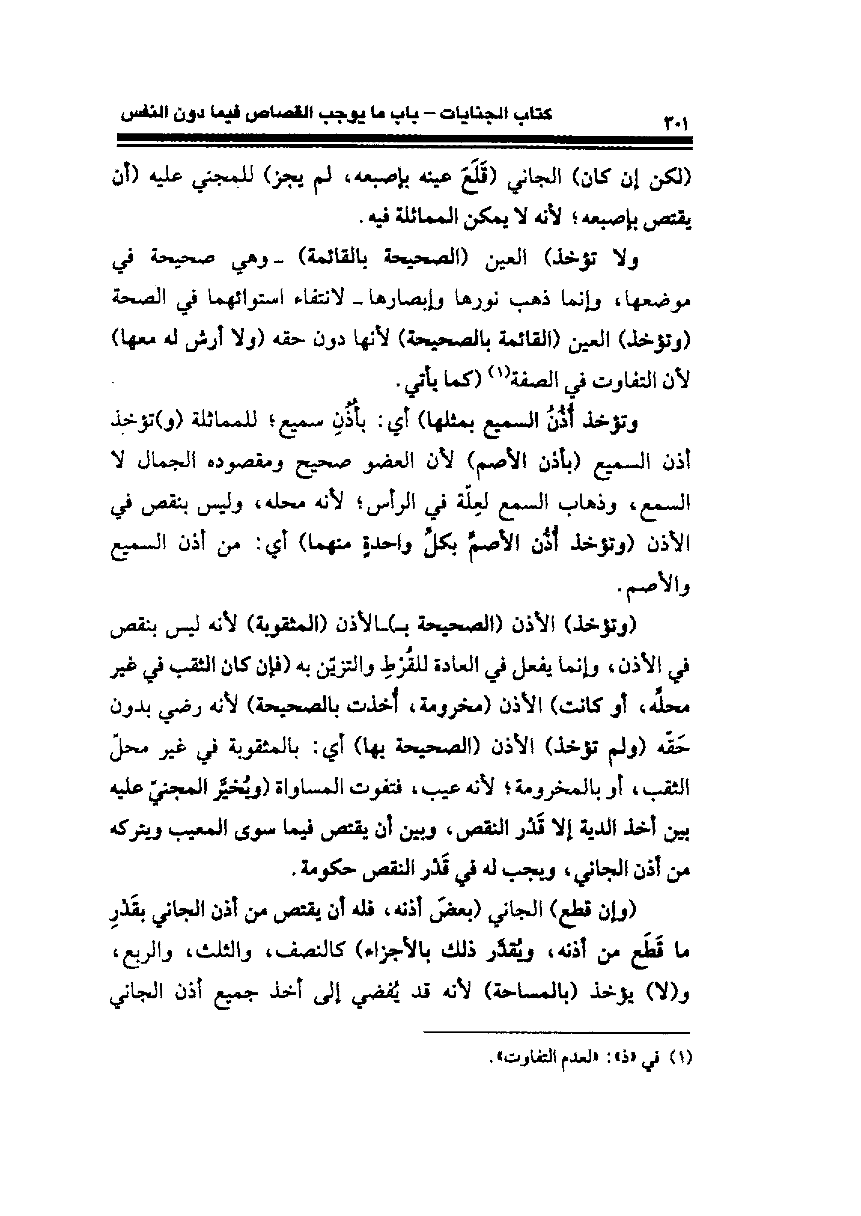 (وتؤخذ) الأذن (الصحيحة بـ) ـالأذن (المثقوبة) لأنه ليس بنقص في الأذن، وإنما يفعل في العادة للقُرْطِ والتزيّن به (فإن كان الثقب في غير محلِّه، أو كانت) الأذن (مخرومة، أُخذت بالصحيحة) لأنه رضي بدون حَقّه (ولم تؤخذ) الأذن (الصحيحة بها) أي: بالمثقوبة في غير محلّ الثقب، أو بالمخرومة؛ لأنه عيب، فتفوت المساواة (ويُخيَّر المجنيّ عليه بين أخذ الدية إلا قَدْر النقص، وبين أن يقتص فيما سوي المعيب ويتركه من أذن الجاني، ويجب له في قَدْر النقص حكومة.