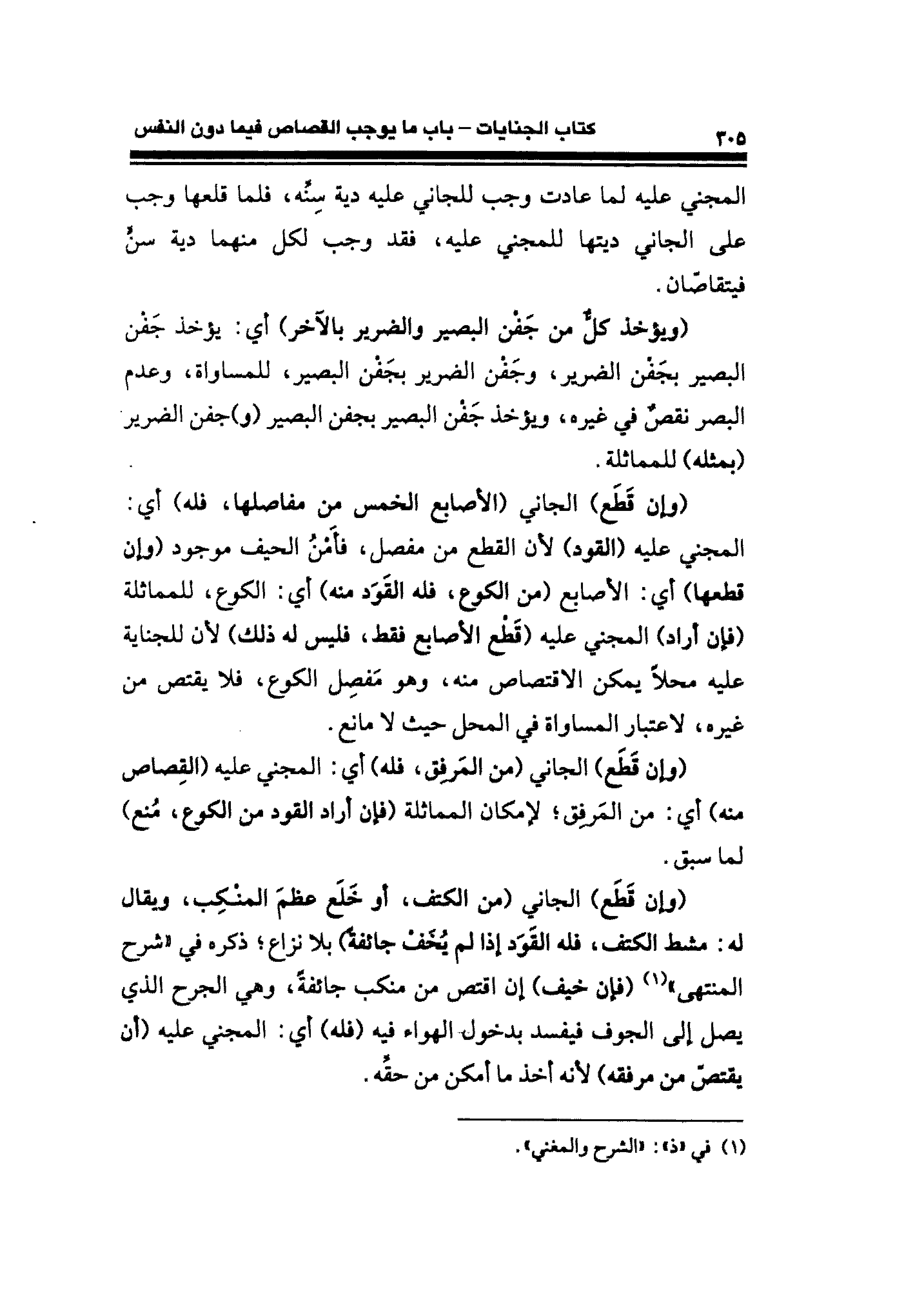 (ويؤخذ كلٌّ من جَفْن البصير والضرير بالآخر) أي: يؤخذ جَفْن البصير بجَفْن الضرير، وجَفْن الضرير بجَفْن البصير، للمساواة، وعدم البصر نقصٌ في غيره، ويؤخذ جَفْن البصير بجفن البصير (و) جفن الضرير (بمثله) للمماثلة.