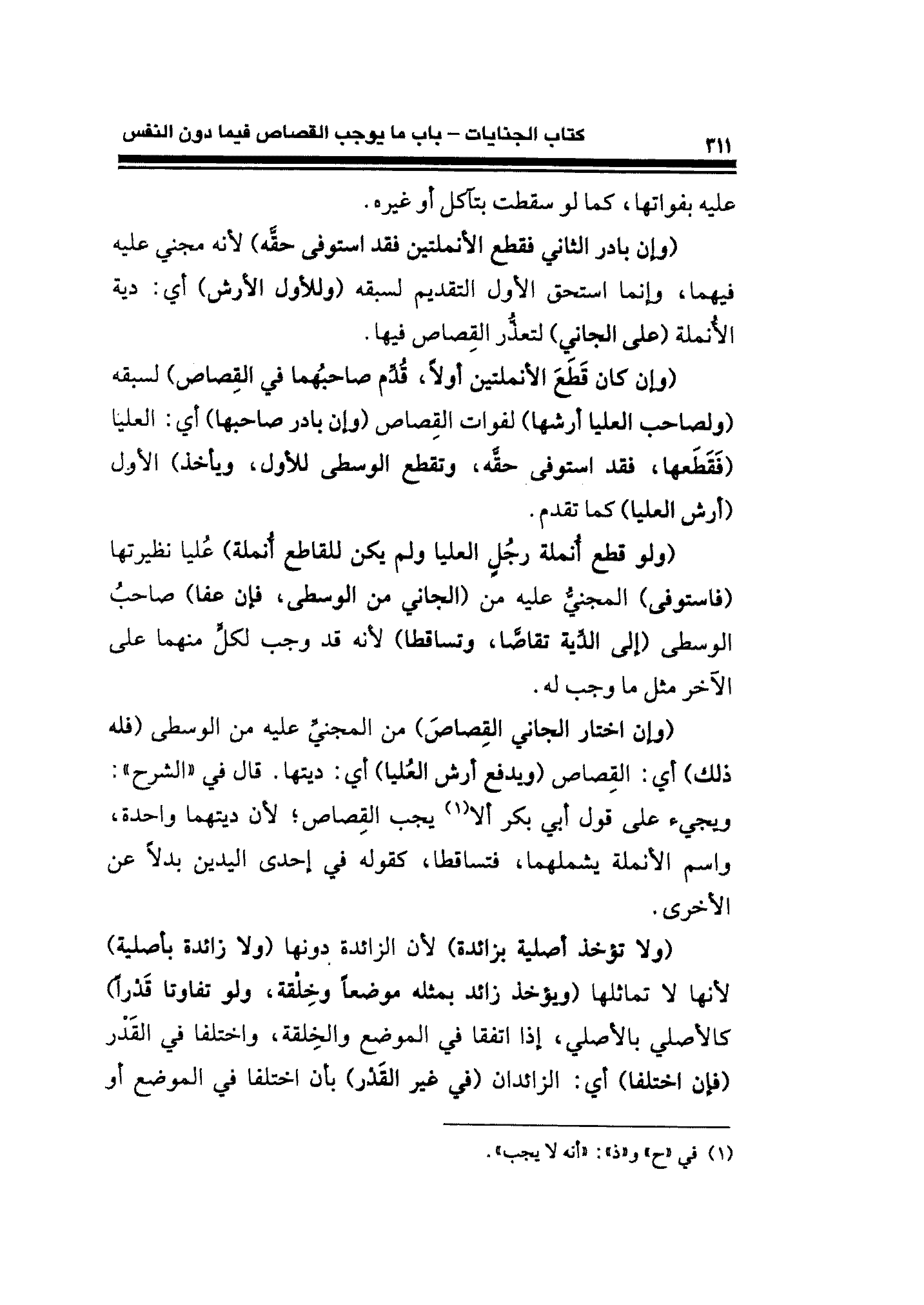(وإن اختار الجاني القِصاصَ) من المجنيِّ عليه من الوسطى (فله ذلك) أي: القِصاص (ويدفع أرش العُليا) أي: ديتها. قال في "الشرح": ويجيء على قول أبي بكر ألا (¬١) يجب القِصاص؛ لأن ديتهما واحدة، واسم الأنملة يشملهما، فتساقطا، كقوله في إحدى اليدين بدلًا عن الأخرى.