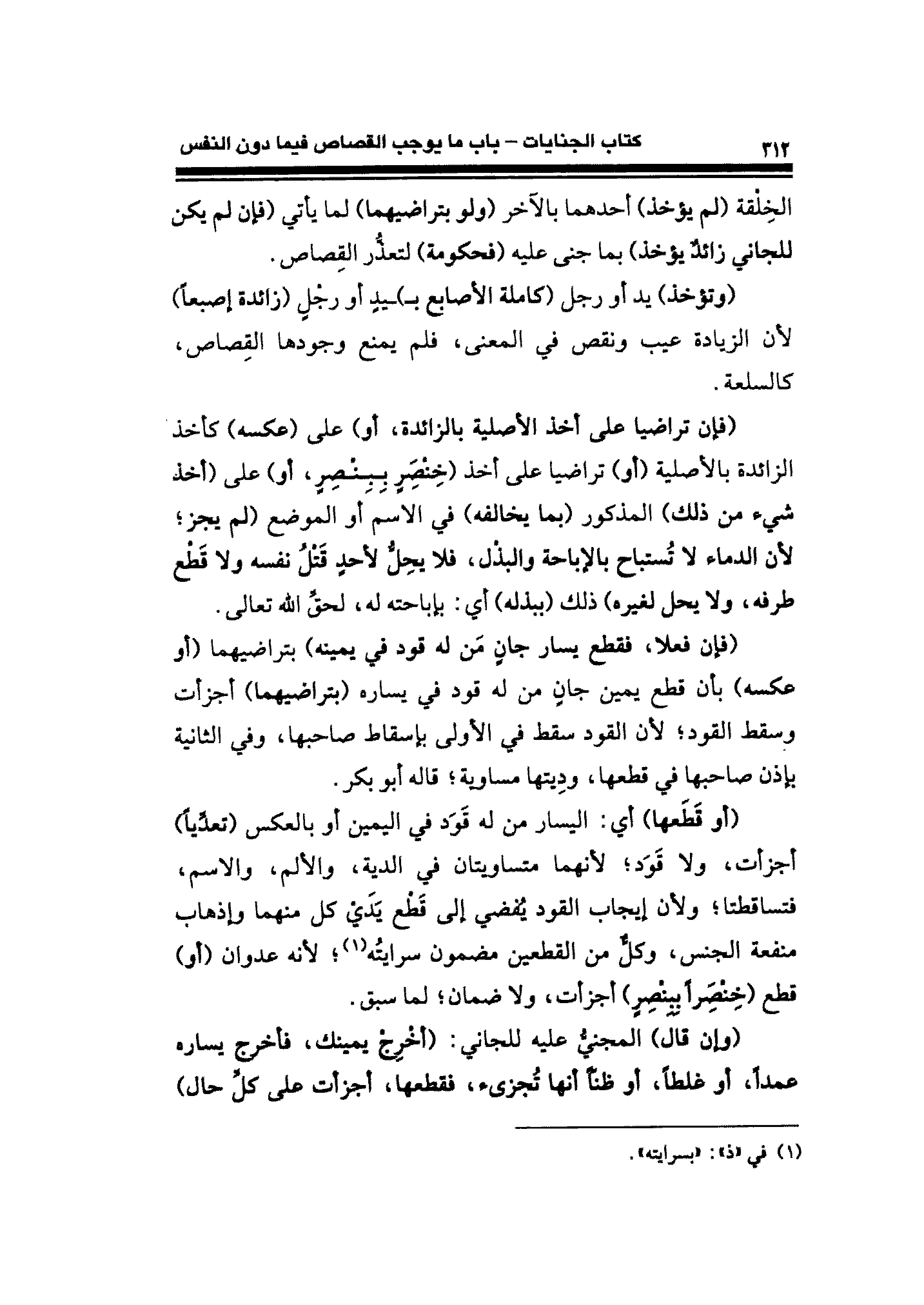 (فإن تراضيا على أخذ الأصلية بالزائدة، أو) على (عكسه) كأخذ الزائدة بالأصلية (أو) تراضيا على أخذ (خِنْصَرٍ ببنْصِرٍ، أو) على (أخذ شيء من ذلك) المذكور (بما يخالفه) في الاسَمَ أو الموضع (لم يجز؛ لأن الدماء لا تُستباح بالإباحة والبذْل، فلا يحِلُّ لأحدٍ قَتْلُ نفسه ولا قَطْع طرفه، ولا يحل لغيره) ذلك (ببذله) أي: بإباحته له، لحقِّ الله تعالى.