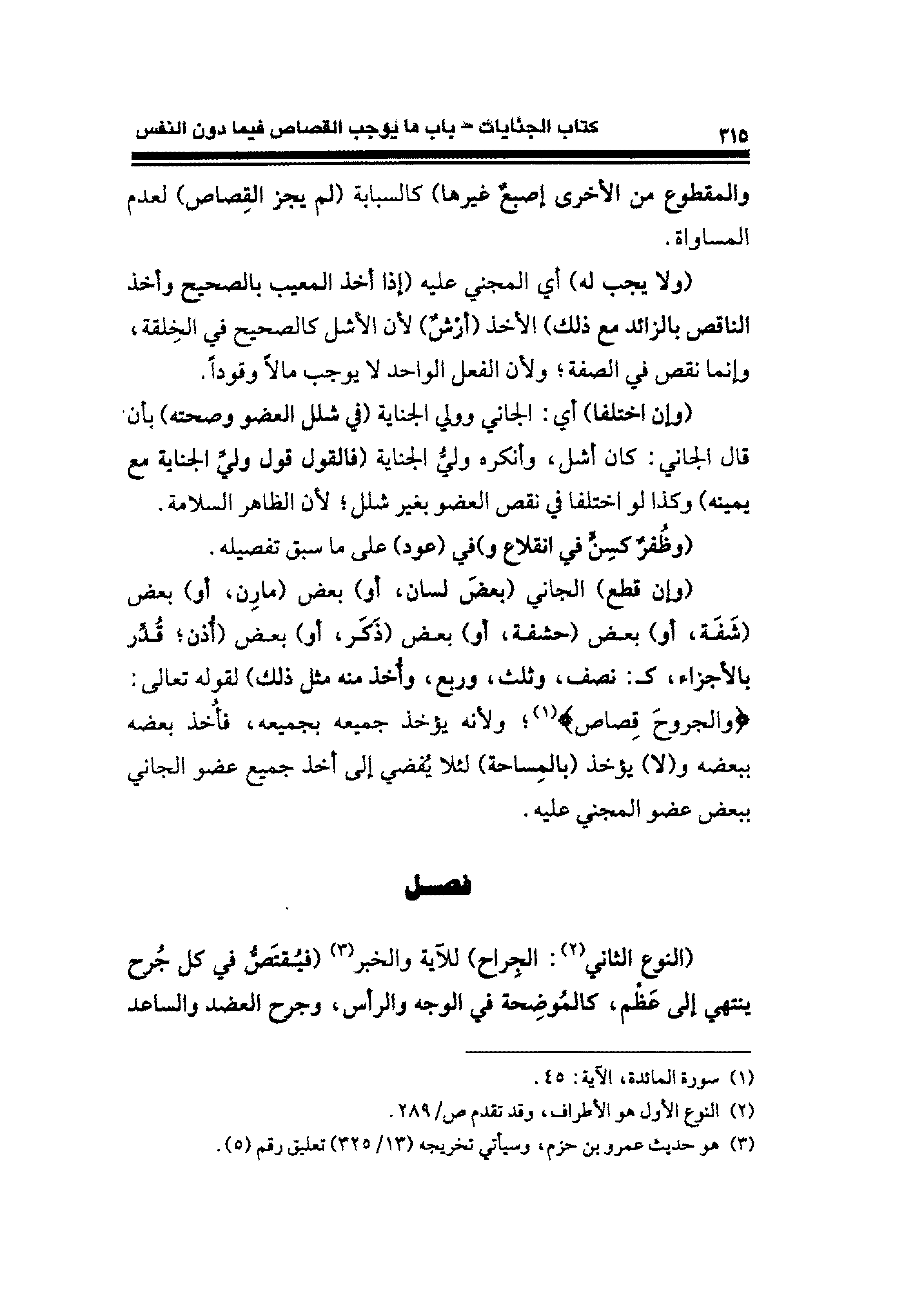 (النوع الثاني (¬٢): الجراح) للآية والخبر (¬٣) (فيُقتَصُّ في كل جُرح ينتهي إلى عَظْم، كالمُوضِحة في الوجه والرأس، وجرح العضد والساعد