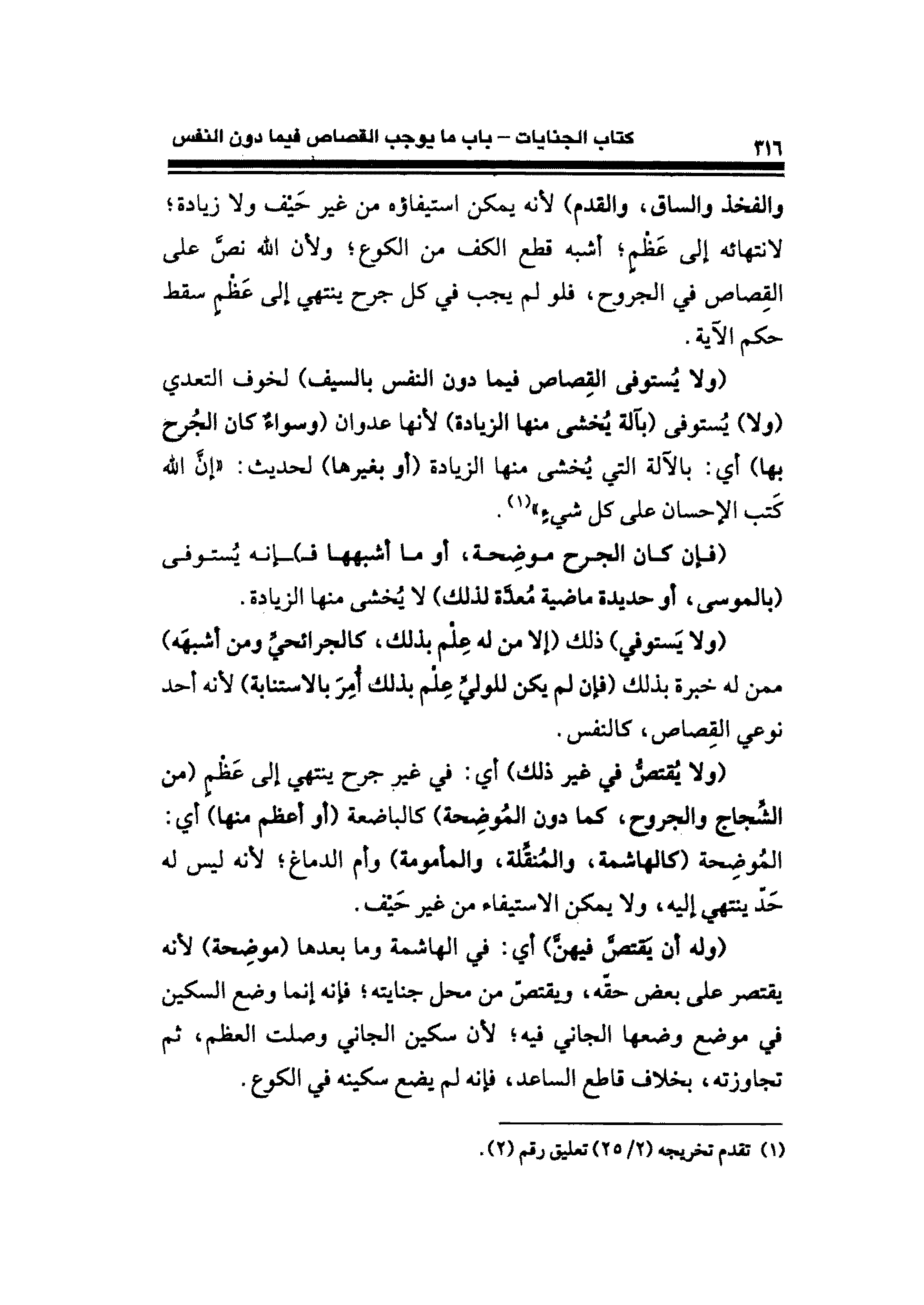والفخذ والساق، والقدم) لأنه يمكن استيفاؤه من غير حَيف ولا زيادة؛ لانتهائه إلى عَظْمٍ؛ أشبه قطع الكف من الكوع؛ ولأن الله نصَّ على القِصاص في الجروح، فلو لم يجب في كل جرح ينتهي إلى عَظْمٍ سقط حكم الآية.