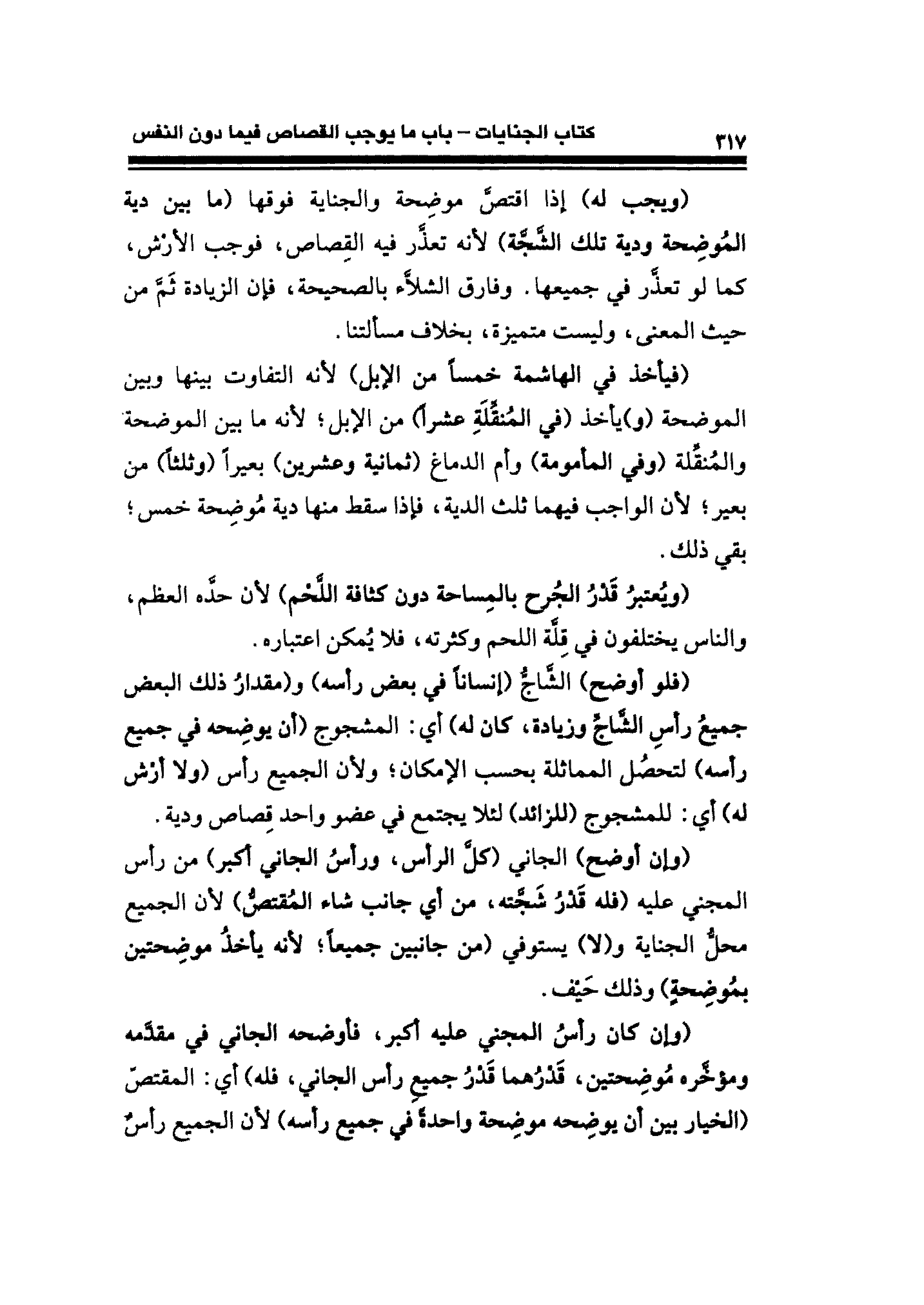 (فلو أوضح) الشَّاجُّ (إنسانًا في بعض رأسه) و (مقدارُ ذلك البعض جميعُ رأسِ الشَّاجِّ وزيادة، كان له) أي: المشجوج (أن يوضِحه في جميع رأسه) لتحصُل المماثلة بحسب الإمكان؛ ولأن الجميع رأس (ولا أرْش له) أي: للمشجوج (للزائد) لئلا يجتمع في عضو واحد قِصاص ودية.
