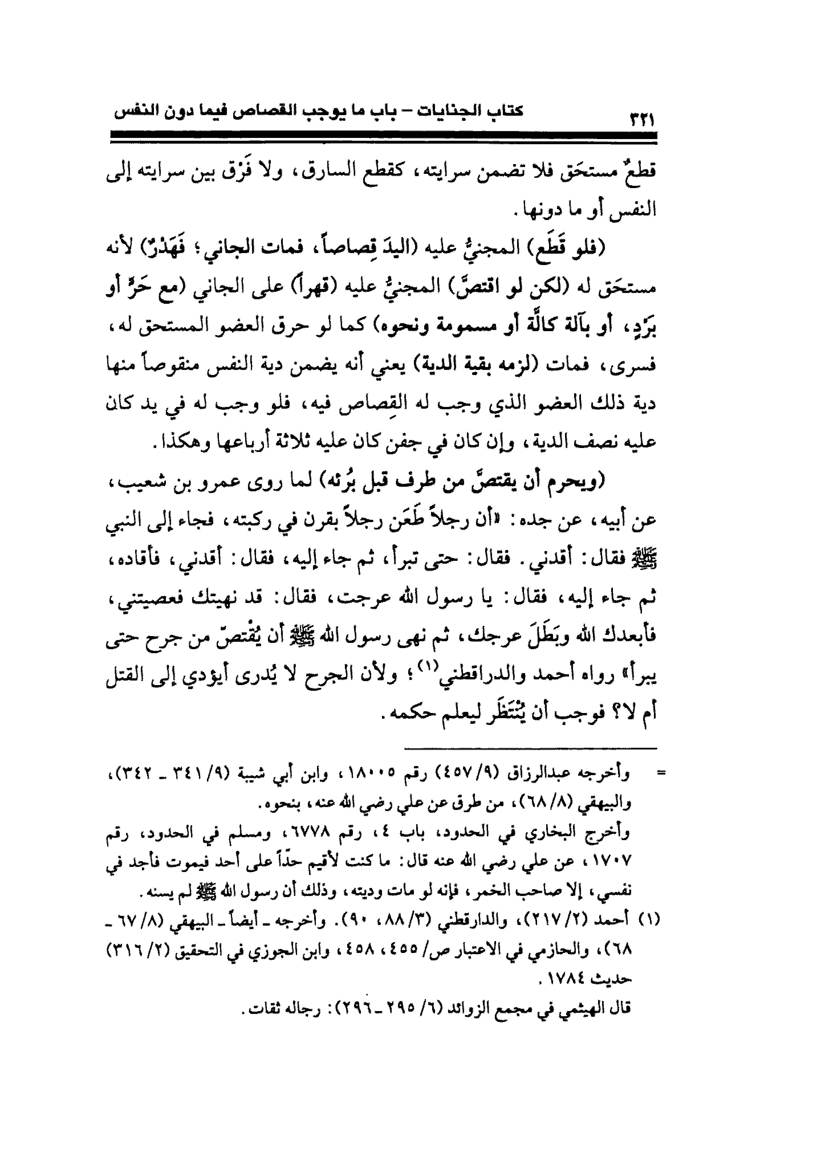 (ويحرم أن يقتصَّ من طرف قبل بُرئه) لما روي عمرو بن شعيب، عن أبيه، عن جده: "أنَّ رجلًا طَعَن رجلًا بقرن في ركبته، فجاء إلى النبي - صلى الله عليه وسلم - فقال: أقدني. فقال: حتَّى تبرأ، ثم جاء إليه، فقال: أقدني، فأقاده، ثم جاء إليه، فقال: يا رسول الله عرجت، فقال: قد نهيتك فعصيتني، فأبعدك الله وبَطَل عرجك، ثم نهى رسول الله - صلى الله عليه وسلم - أن يُقْتصّ من جرح حتَّى يبرأ" رواه أحمد والدراقطني (¬١)؛ ولأن الجرح لا يُدرى أيؤدي إلى القتل أم لا؟ فوجب أن يُنْتَظر ليعلم حكمه.