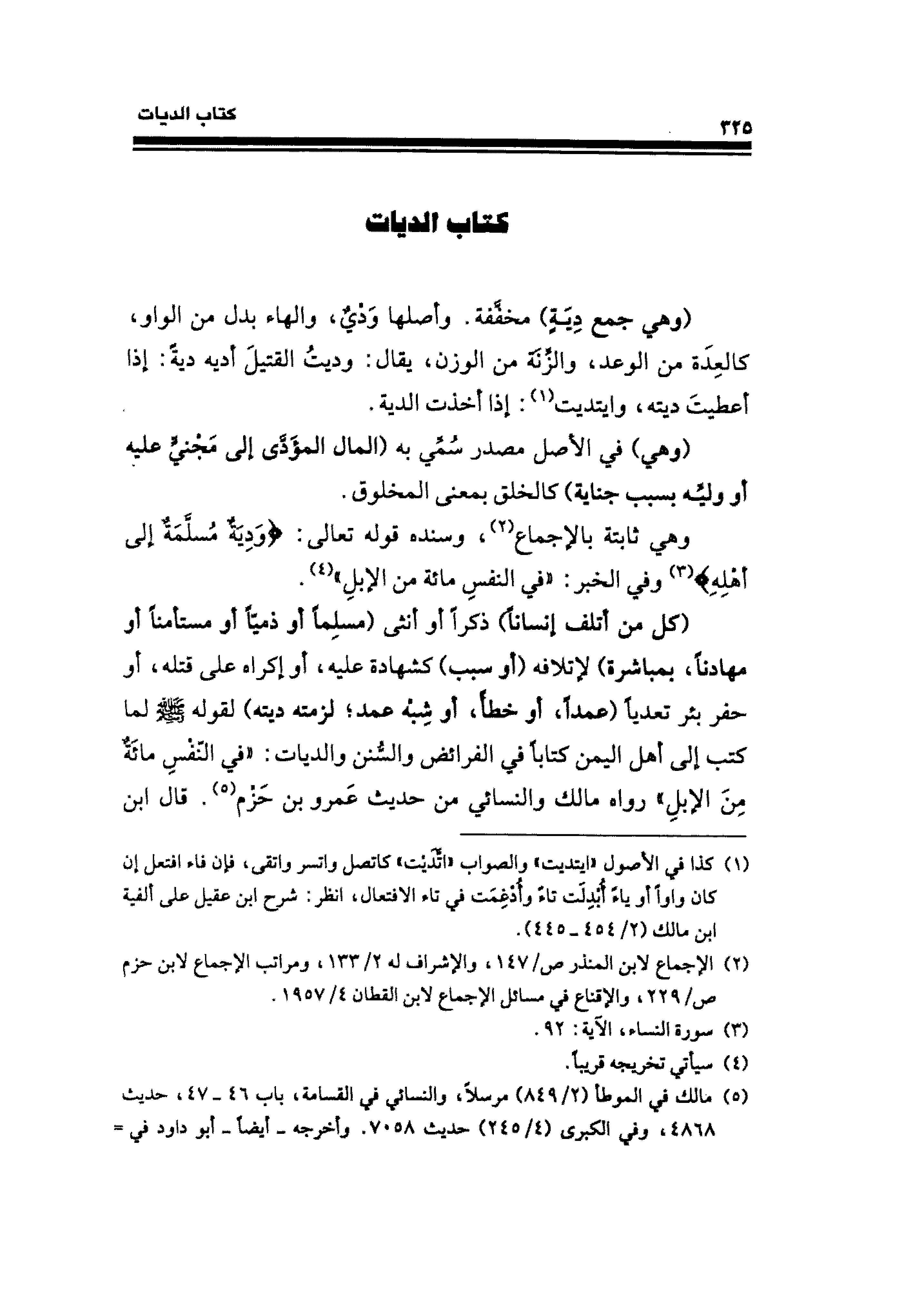 وهي ثابتة بالإجماع (¬٢)، وسنده قوله تعالى: {وَدِيَةٌ مُسَلَّمَةٌ إِلَى أَهْلِهِ} (¬٣) وفي الخبر: "في النفسِ مائة من الإبلِ" (¬٤).