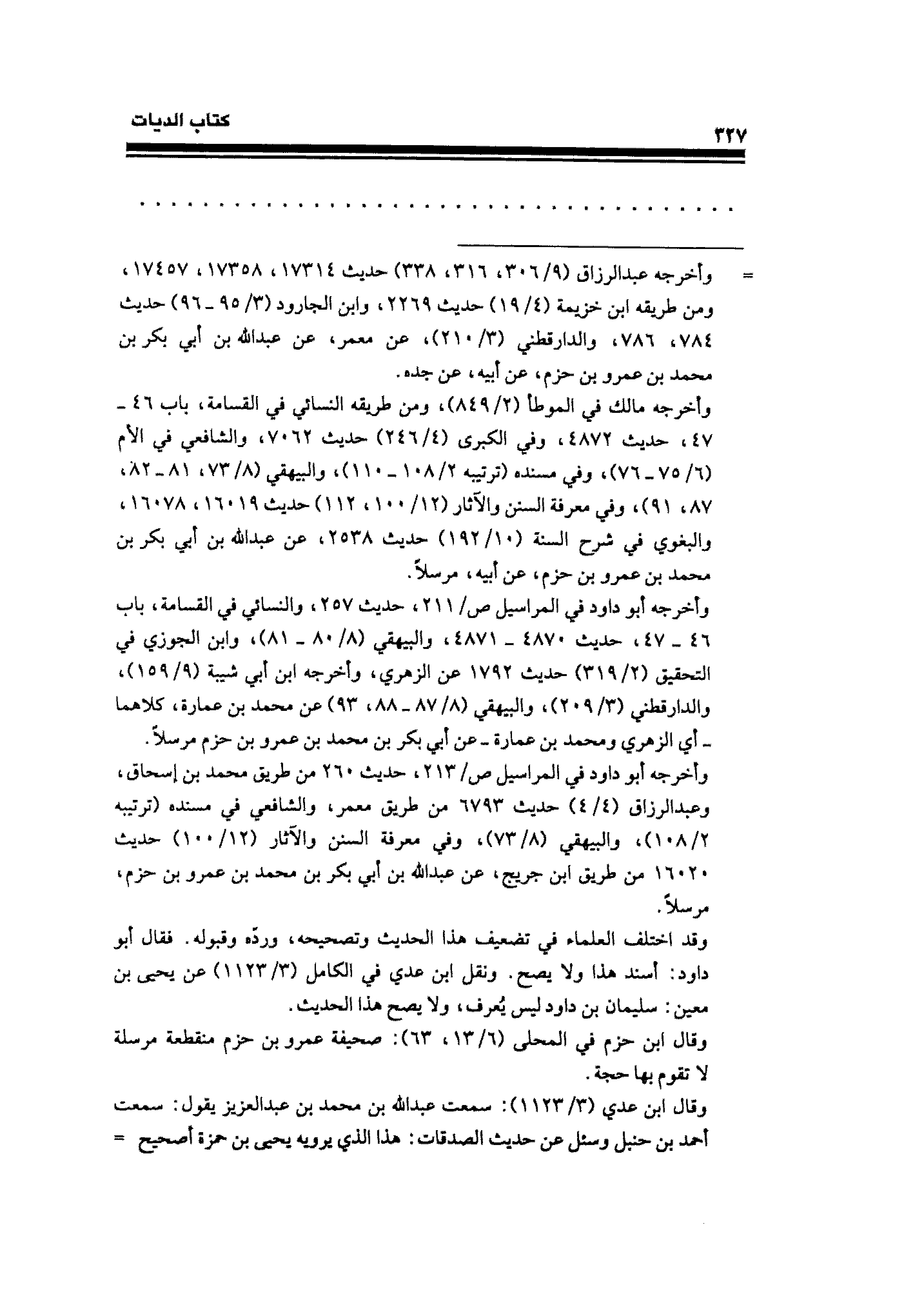 وقال ابن حزم في المحلى (٦/ ١٣، ٦٣): صحيفة عمرو بن حزم منقطعة مرسلة لا تقوم بها حجة.