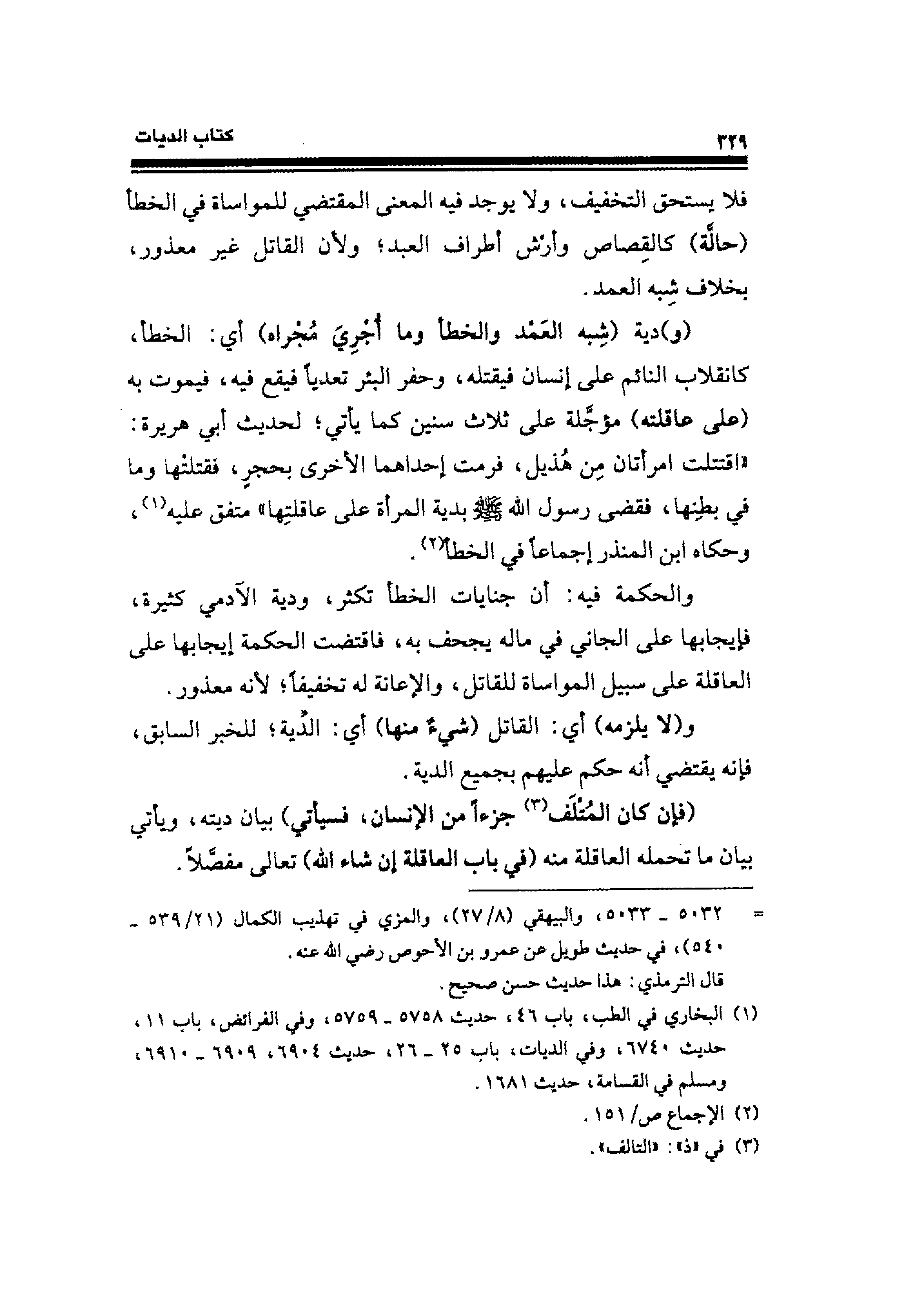 (و) دية (شِبه العَمْد والخطأ وما أُجْرَيَ مُجْراه) أي: الخطأ، كانقلاب النائم على إنسان فيقتله، وحفر البئر تعديًا فيقع فيه، فيموت به (على عاقلته) مؤجَّلة على ثلاث سنين كما يأتي؛ لحديث أبي هريرة: "اقتتلت امرأتان مِن هُذيل، فرمت إحداهما الأخرى بحجرٍ، فقتلتْها وما في بطنِها، فقضى رسول الله - صلى الله عليه وسلم - بدية المرأة على عاقلتها" متفق عليه (¬١)، وحكاه ابن المنذر إجماعًا في الخطأ (¬٢).