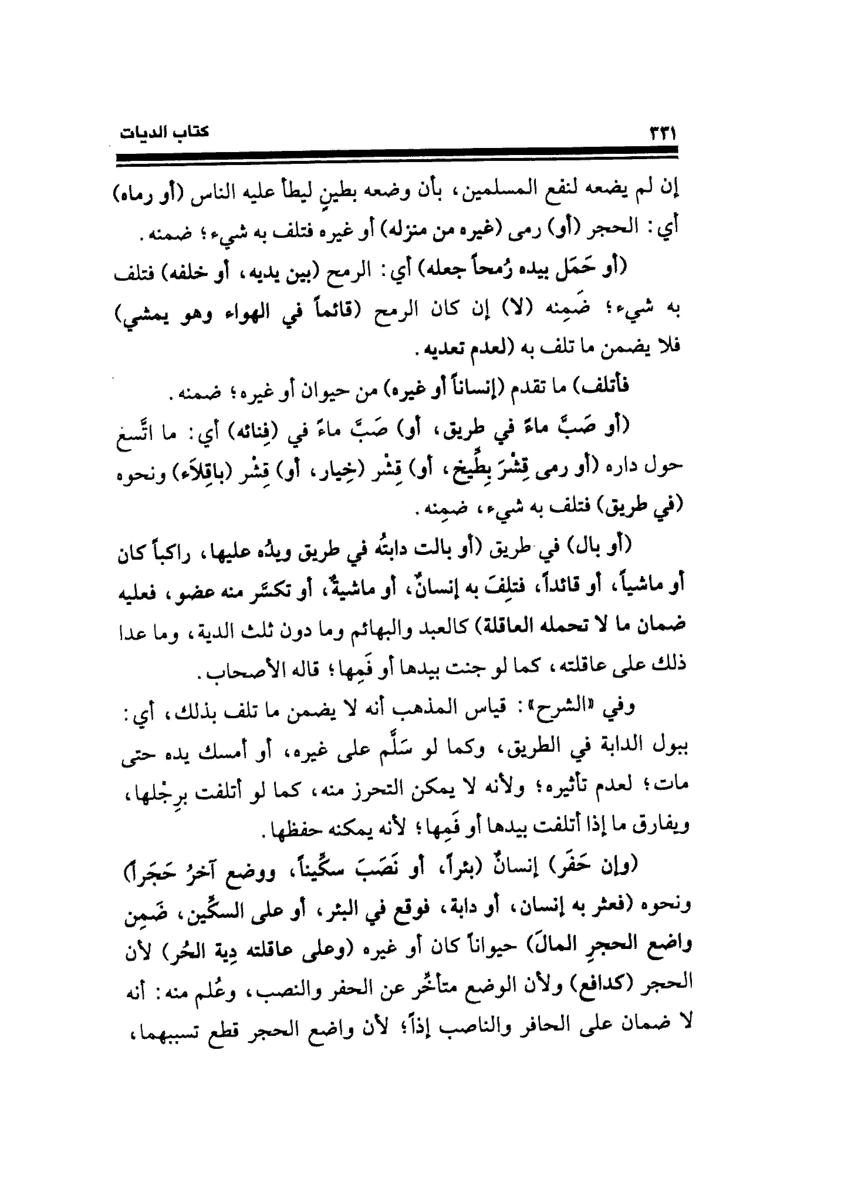 (أو بال) في طريق (أو بالت دابتُه في طريق وبدُه عليها، راكيًا كان أو ماشيًا، أو قائدًا، فتلِفَ به إنسانٌ، أو ماشيةٌ، أو تكسَّر منه عضو، فعليه ضمان ما لا تحمله العاقلة) كالعبد والبهائم وما دون ثلث الدية، وما عدا ذلك على عاقلته، كما لو جنت بيدها أو فَمِها؛ قاله الأصحاب.