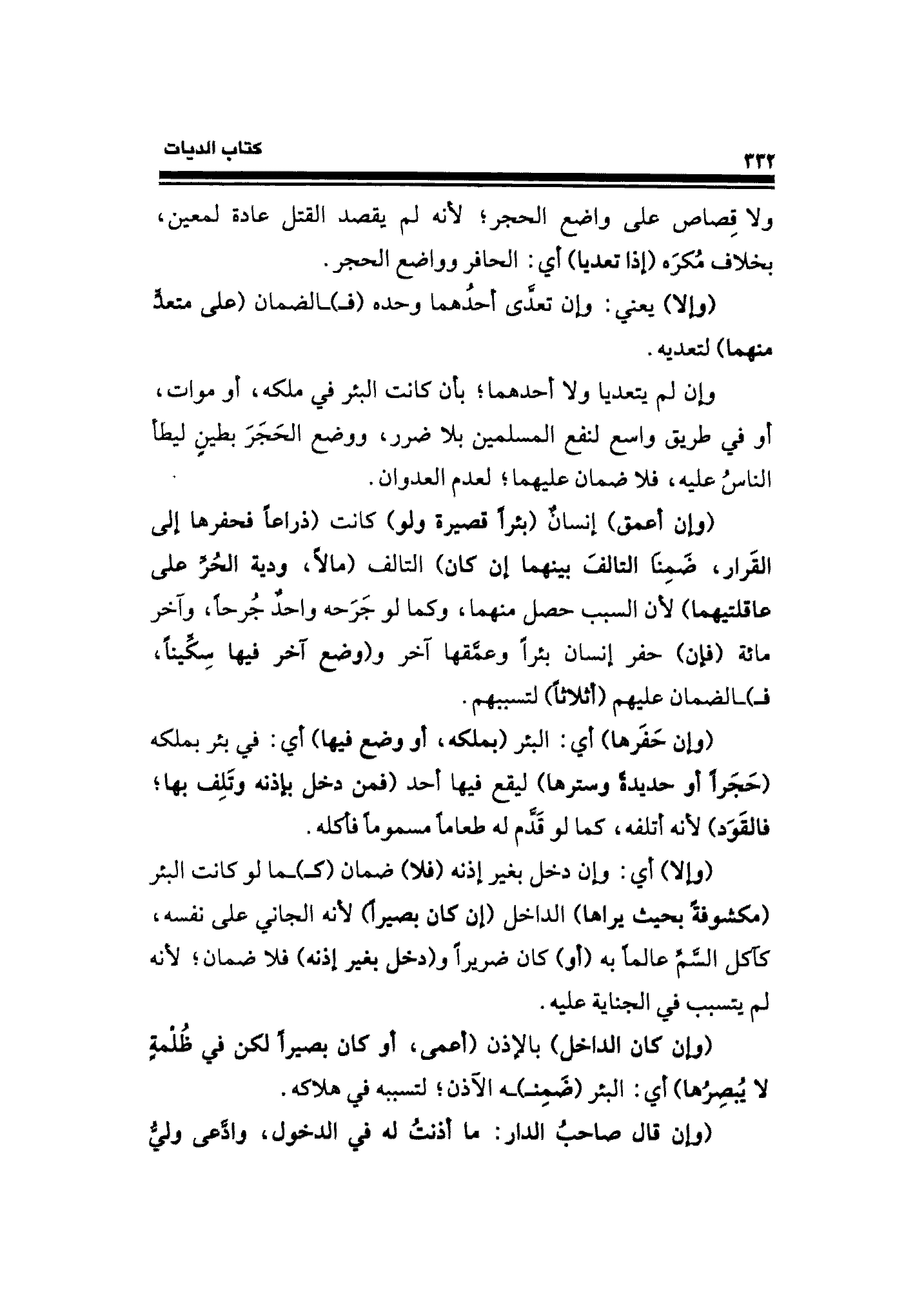 ولا قِصاص على واضع الحجر؛ لأنه لم يقصد القتل عادة لمعين، بخلاف مُكرَه (إذا تعديا) أي: الحافر وواضع الحجر.