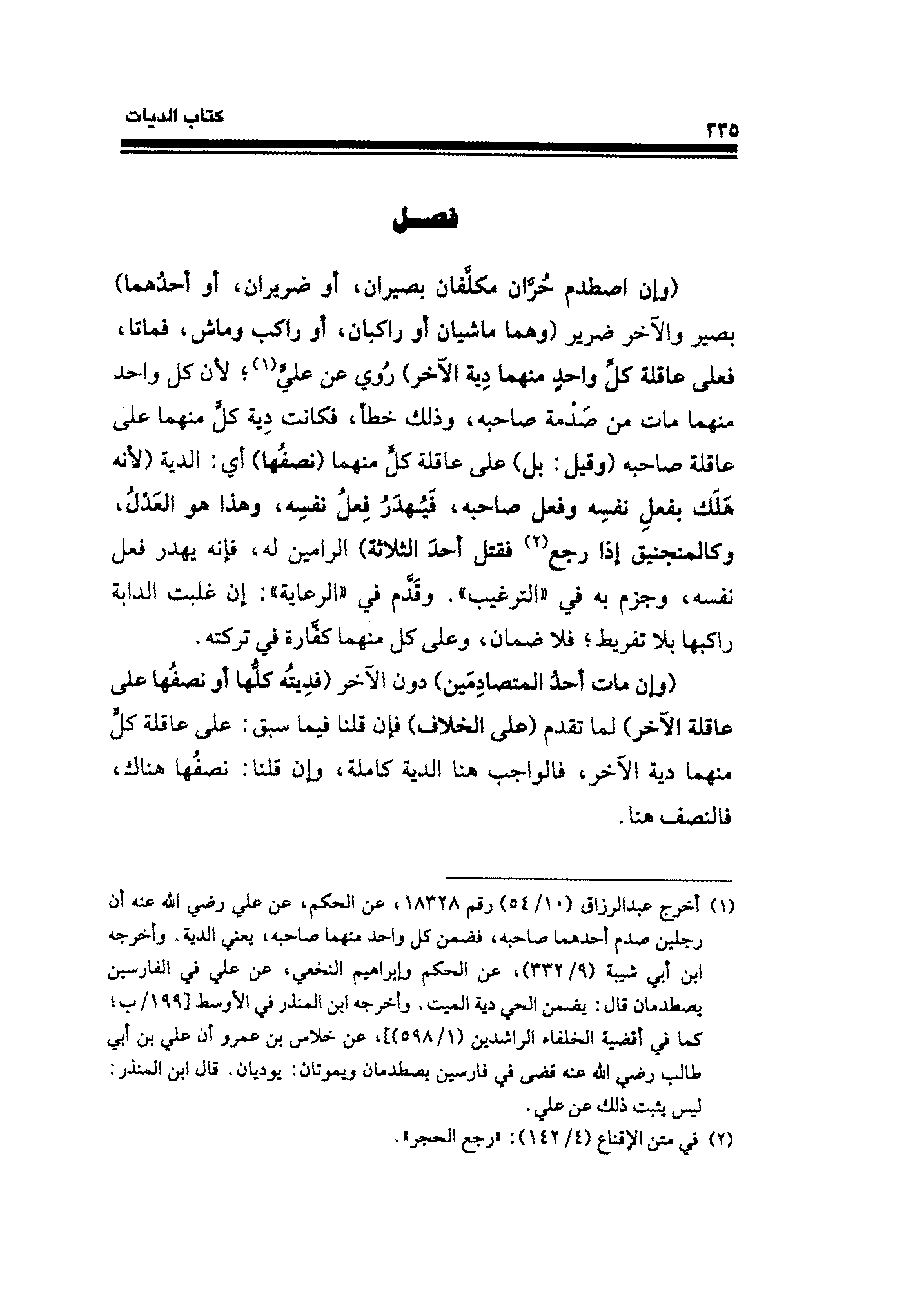 (¬١) أخرج عبد الرزاق (١٠/ ٥٤) رقم ١٨٣٢٨، عن الحكم، عن علي رضي الله عنه أن رجلين صدم أحدهما صاحبه، فضمن كل واحد منهما صاحبه، يعني الدية. وأخرجه ابن أبي شيبة (٩/ ٣٣٢) عن الحكم وإبراهيم النخعي، عن علي في الفارسين يصطدمان قال: يضمن الحي دية الميت. وأخرجه ابن المنذر في الأوسط [١٩٩/ ب؛ كما في أقضية الخلفاء الراشدين (١/ ٥٩٨)]، عن خلاس بن عمرو أن علي بن أبي طالب رضي الله عنه قضى في فارسين يصطدمان ويموتان؛ يوديان. قال ابن المنذر: ليس يثبت ذلك عن علي.