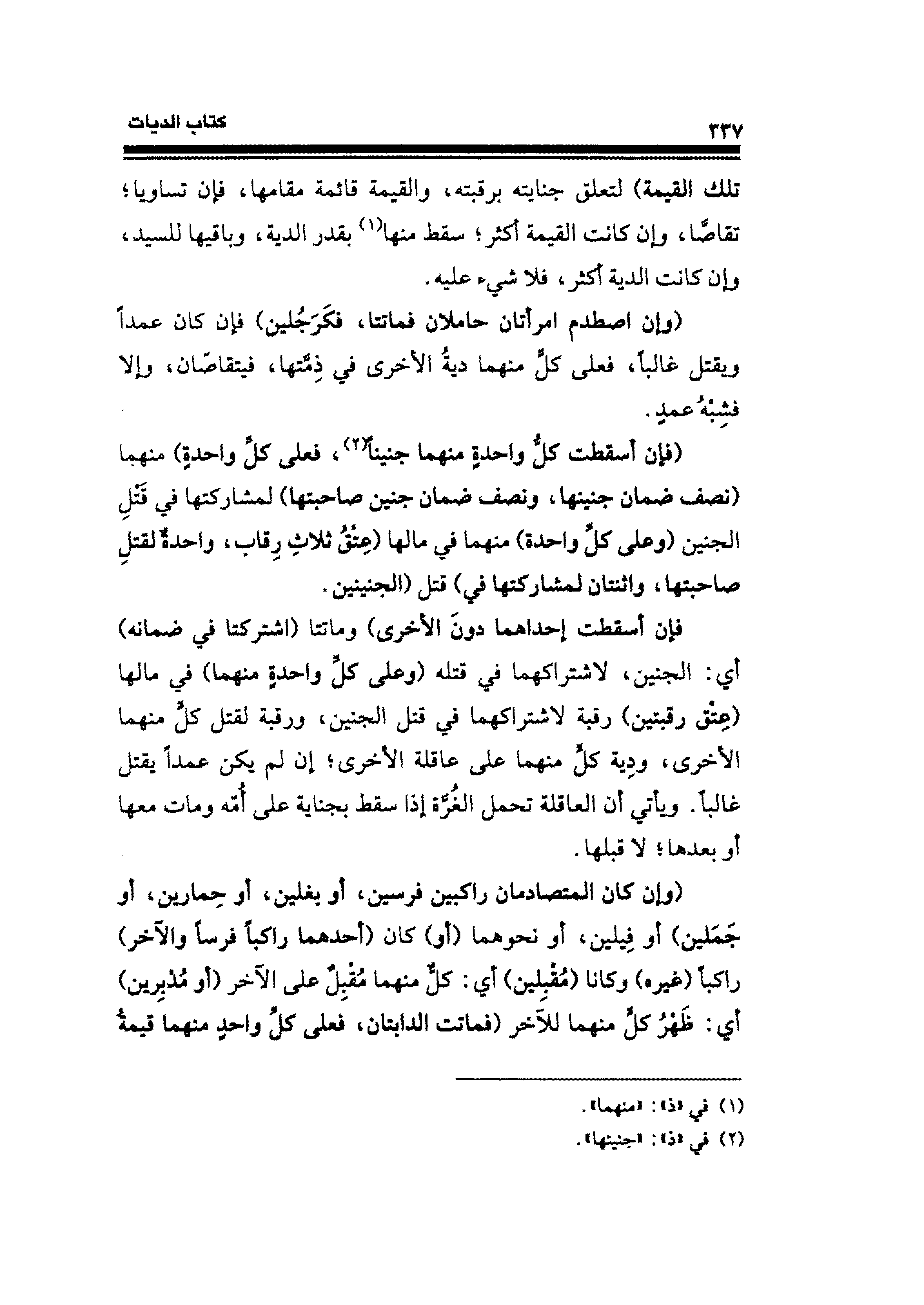 (وإن اصطدم امرأتان حاملان فماتتا، فكَرَجُلين) فإن كان عمدًا ويقتل غالبًا، فعلى كلٍّ منهما ديةُ الأخرى في ذِمَّتها، فيتقاصّان، وإلا فشِبْهُ عمدٍ.