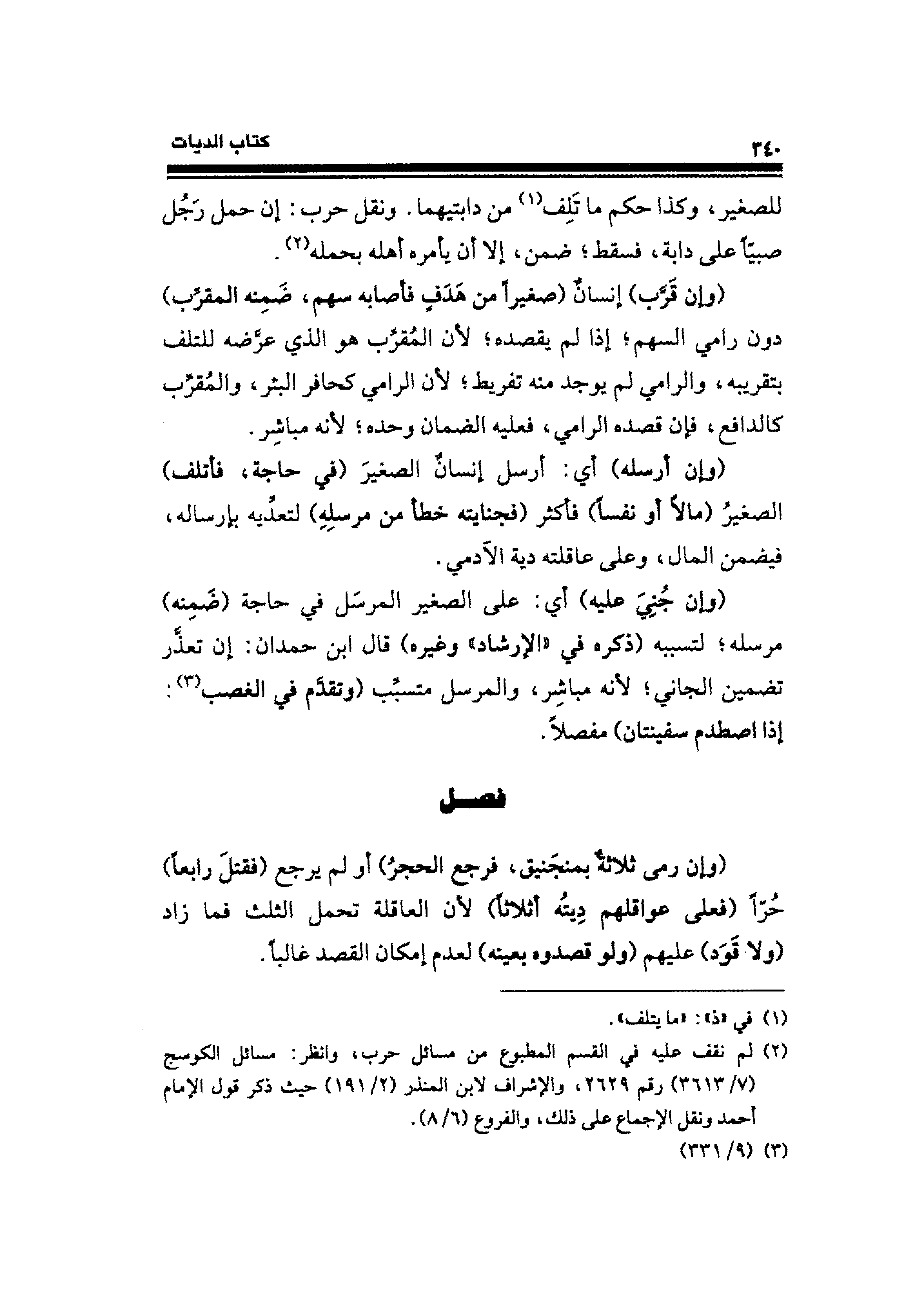 (وإن قَرَّب) إنسانٌ (صغيرًا من هَدَفٍ فأصابه سهم، ضَمِنه المقرِّب) دون رامي السم؛ (إذا لم يقصده؛ لأن المُقرِّب هو الذي عرَّضه للتلف بتقريبه، والرامي لم يوجد منه تفريط؛ لأن الرامي كحافر البئر، والمُقرِّب كالدافع، فإن قصده الرامى، فعليه الضمان وحده؛ لأنه مباشِر.