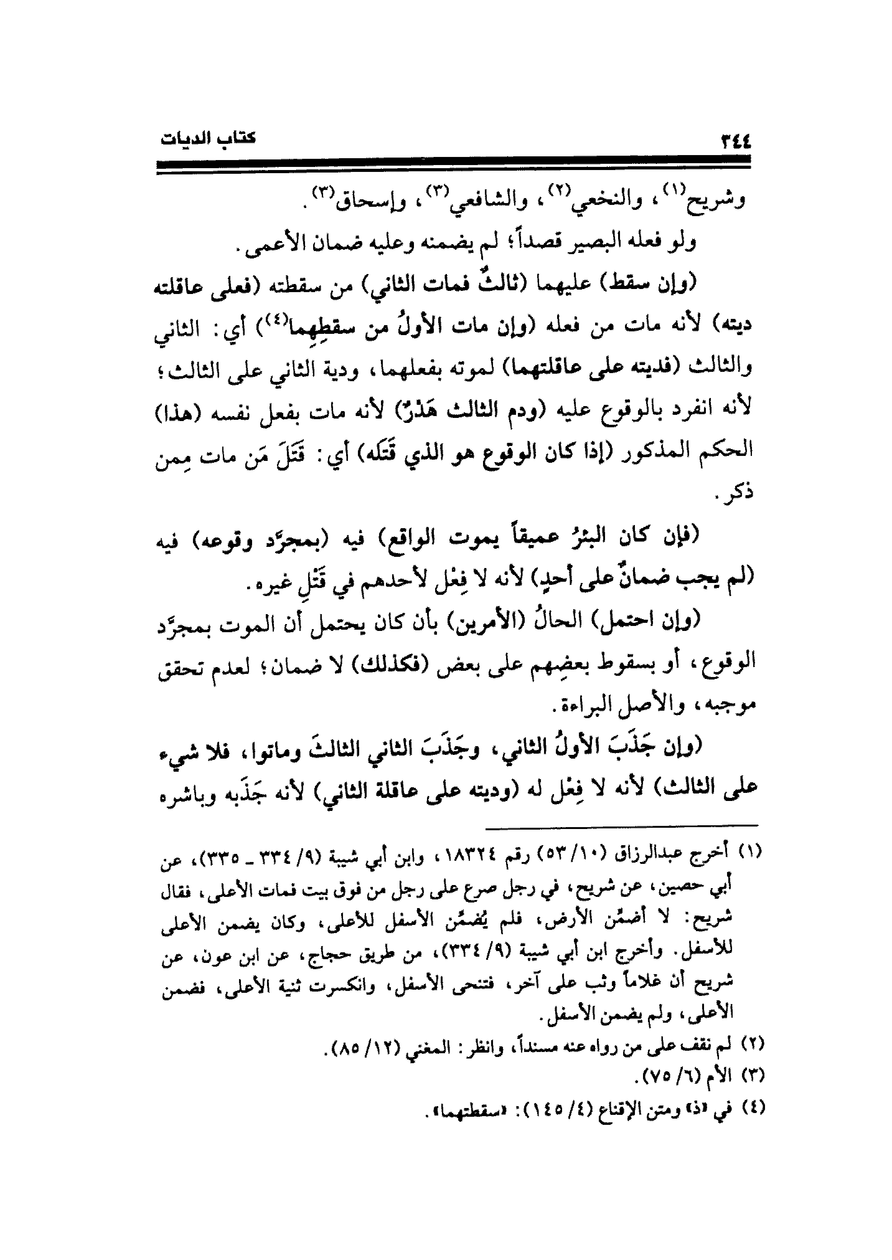 (¬١) أخرج عبد الرزاق (١٠/ ٥٣) رقم ١٨٣٢٤، وابن أبي شيبة (٩/ ٣٣٨ - ٣٣٥)، عن أبي حصين، عن شريح، في رجل صرع على رجل من فوق بيت فمات الأعلى، فقال شريح: لا أضمِّن الأرض، فلم يُضمِّن الأسفل للأعلى، وكان يضمن الأعلى للأسفل. وأخرج ابن أبي شيبة (٩/ ٣٣٤)، من طريق حجاج، عن ابن عون، عن شريح أن غلامًا وثب على آخر، فتنحى الأسفل، وانكسرت ثنية الأعلى، فضمن الأعلى، ولم يضمن الأسفل.