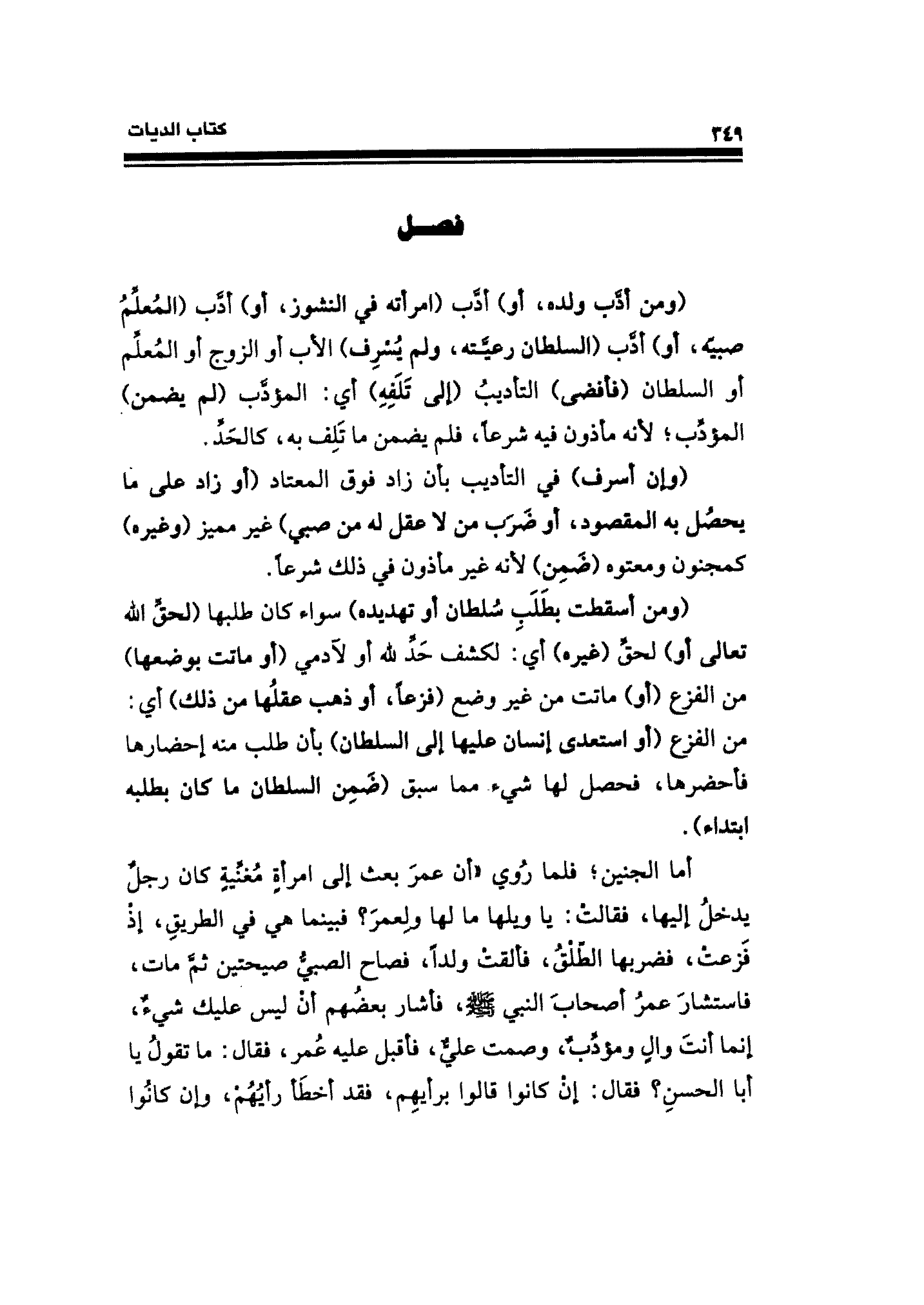 أما الجنين؛ فلما رُوي "إن عمرَ بعث إلى امرأةٍ مُغنِّيةٍ كان رجلٌ يدخلُ إليها، فقالت: يا ويلها ما لها ولعمرَ؟ فبينما هي في الطريقِ، إذْ فَزعتْ، فضربها الطّلْقُ، فألقت ولدًا، فصاح الصبيُّ صيحتين ثمَّ مات، فاستشارَ عمرُ أصحابَ النبي - صلى الله عليه وسلم -، فأشار بعضُهم أنْ ليس عليك شيءٌ، إنما أنتَ والٍ ومؤدِّبٌ، وصمت عليٌّ، فأقبل عليه عُمر، نقال: ما تقولُ يا أبا الحسن؟ فقال: إنْ كانوا قالوا برأيهِم، ففد أخطَأ رأيُهُمْ، وإن كانُوا