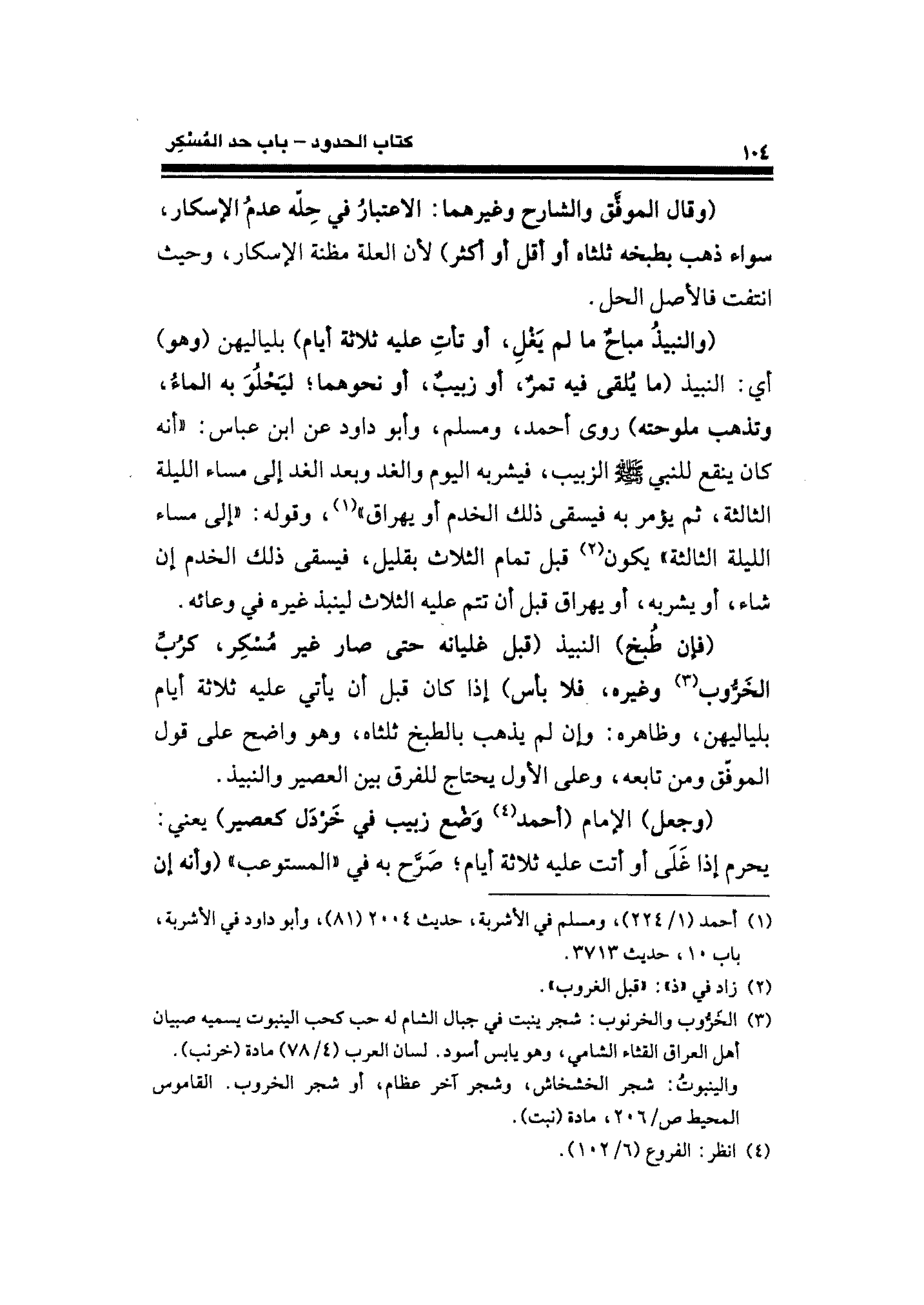 (والنبيذُ مباحٌ ما لم يَغْلِ، أو تأتِ عليه ثلاثة أيام) بلياليهن (وهو) أي: النبيذ (ما يُلقى فيه تمرٌ، أو زبيبٌ، أو نحوهما؛ ليَحْلُوَ به الماءُ، وتذهب ملوحته) روى أحمد، ومسلم، وأبو داود عن ابن عباس: "أنه كان ينقع للنبي - صلى الله عليه وسلم - الزبيب، فيشربه اليوم والغد وبعد الغد إلى مساء الليلة الثالثة، ثم يؤمر به فيسقى ذلك الخدم أو يهراق" (¬١)، وقوله: "إلى مساء الليلة الثالثة" يكون (¬٢) قبل تمام الثلاث بقليل، فيسقى ذلك الخدم إن شاء، أو يشربه، أو يهراق قبل أن تتم عليه الثلاث لينبذ غيره في وعائه.