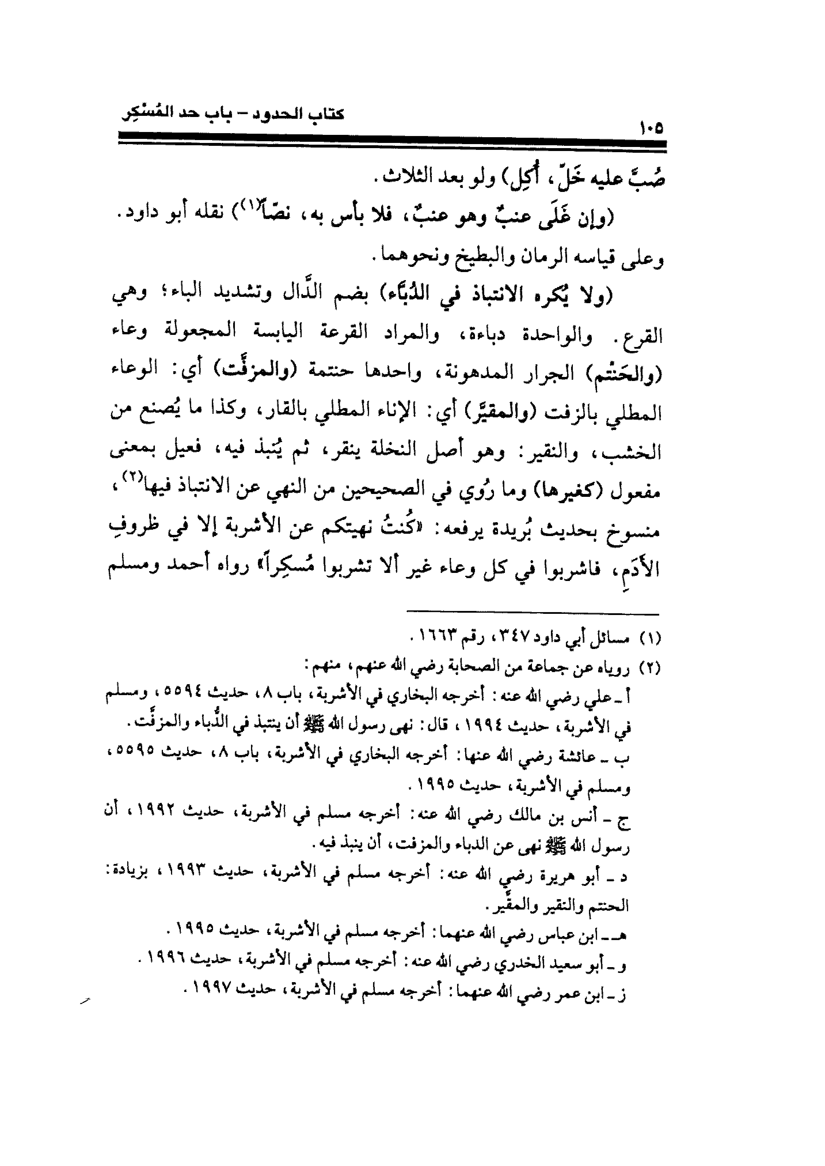 (ولا يُكره الانتباذ في الدُبَّاء) بضم الدَّال وتشديد الباء؛ وهي الفرع. والواحدة دباءة، والمراد القرعة اليابسة المجعولة وعاء (والحَنتْم) الجرار المدهونة، واحدها حنتمة (والمزفَّت) أي: الوعاء المطلي بالزفت (والمقيَّر) أي: الإناء المطلي بالقار، وكذا ما يُصنع بن الخشب، والنقير: وهو أصل النخلة ينقر، ثم يُنبذ فيه، فعيل بمعنى مفعول (كغيرها) وما رُوي في الصحيحين من النهي عن الانتباذ فيها (¬٢)، منسوخ بحديث بُريدة يرفعه: "كنتُ نهيتكم عن الأشربة إلا في ظروفِ الأَدَمِ، فاشربوا في كل وعاء غير ألا تشربوا مُسكِرًا" رواه أحمد ومسلم