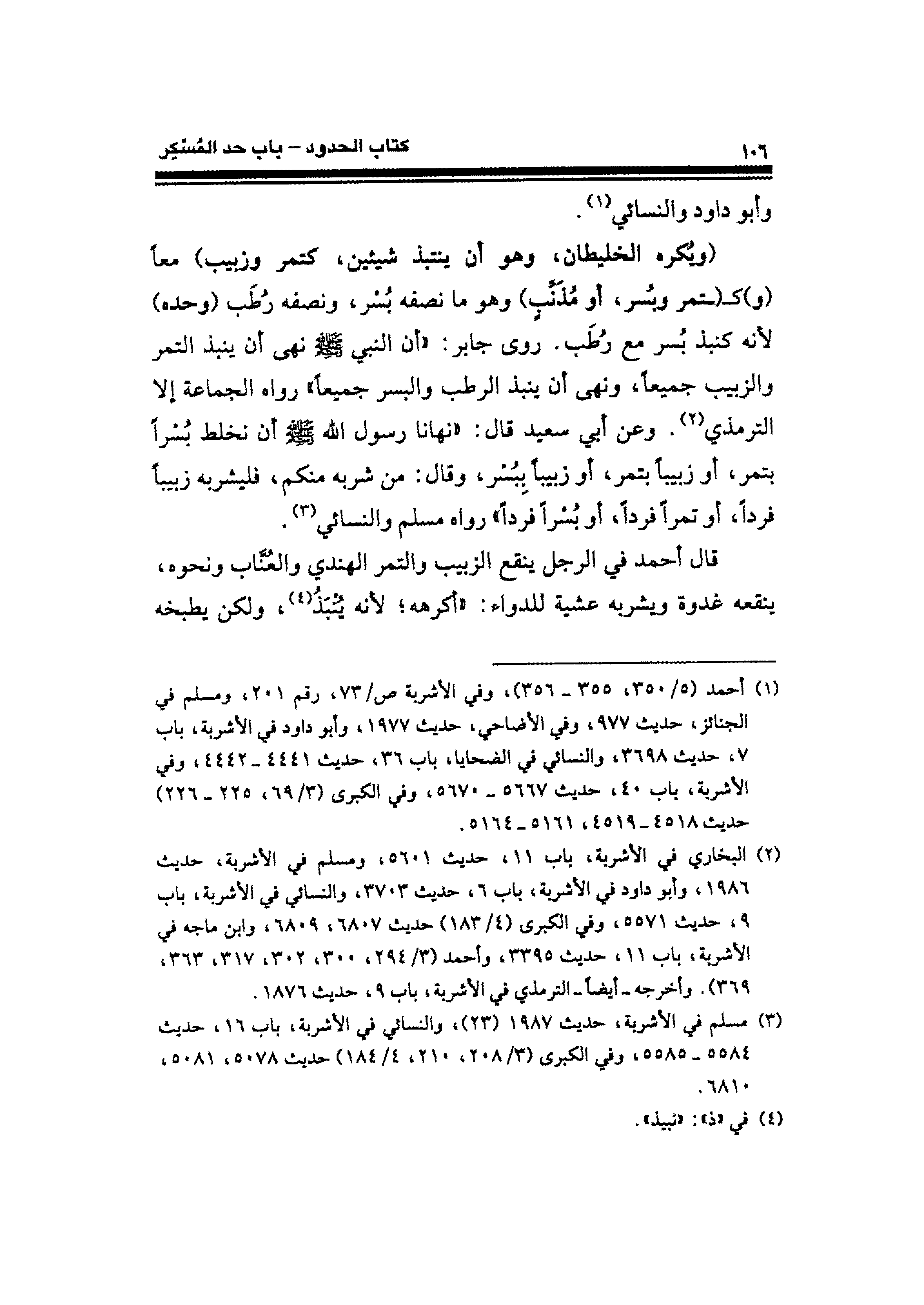 (ويُكره الخليطان، وهو أن ينتبذ شيئين، كتمر وزبيب) معًا (و) كـ (ـتمر وبُسر، أو مُذَنِّبٍ) وهو ما نصفه بُسْر، ونصفه رُطَب (وحده) لأنه كنبذ بُسر مع رُطَب. روى جابر: "أن النبي - صلى الله عليه وسلم - أن ينبذ التمر والزبيب جميعًا، ونهى أن ينبذ الرطب والبسر جميعًا" رواه الجماعة إلا الترمذي (¬٢). وعن أبي سعيد قال: "نهانا رسول الله - صلى الله عليه وسلم - أن نخلط بُسْرًا بتمر، أو زبيبًا بتمر، أو زبيبًا بِبُسْر، وقال: من شربه منكم، فليشربه زبيبًا فردًا، أو تمرًا فردًا، أو بُسْرًا فردًا" رواه مسلم والنسائي (¬٣).
