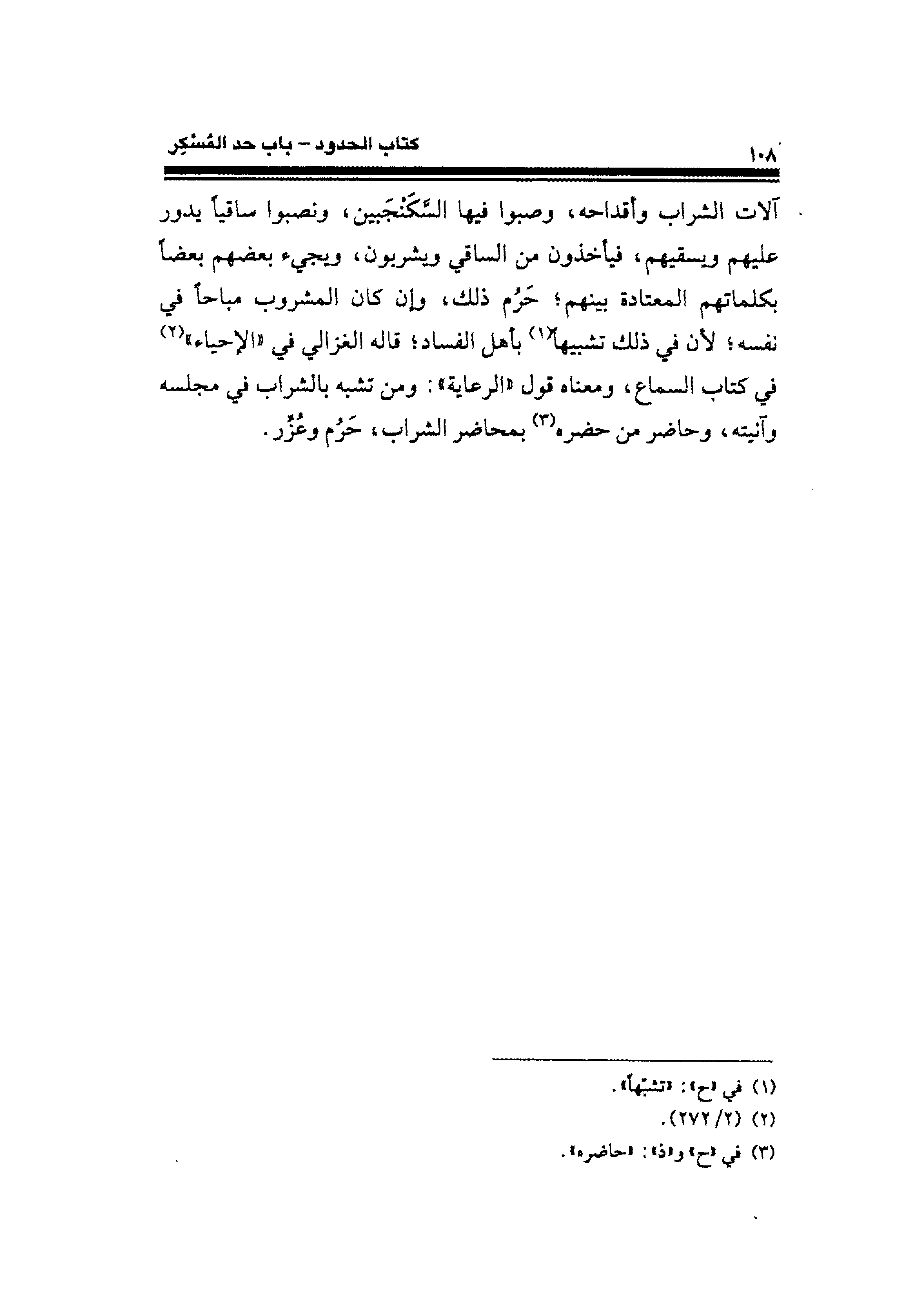 آلات الشراب وأقداحه، وصبوا فيها السَّكَنْجَبين، ونصبوا ساقيًا يدور عليهم ويسقيهم، فيأخذون من الساقي ويشربون، ويجيء بعضهم بعضًا بكلماتهم المعتادة بينهم؛ حَرُم ذلك، وإن كان المشروب مباحًا في نفسه؛ لأنَّ في ذلك تشبيهًا (¬١) بأهل الفساد؛ قاله الغزالي في "الإحياء" (¬٢) في كتاب السماع، ومعناه قول "الرعاية": ومن تشبه بالشراب في مجلسه وآنيته، وحاضر من حضره (¬٣) بمحاضر الشراب، حَرُم وعُزِّر.