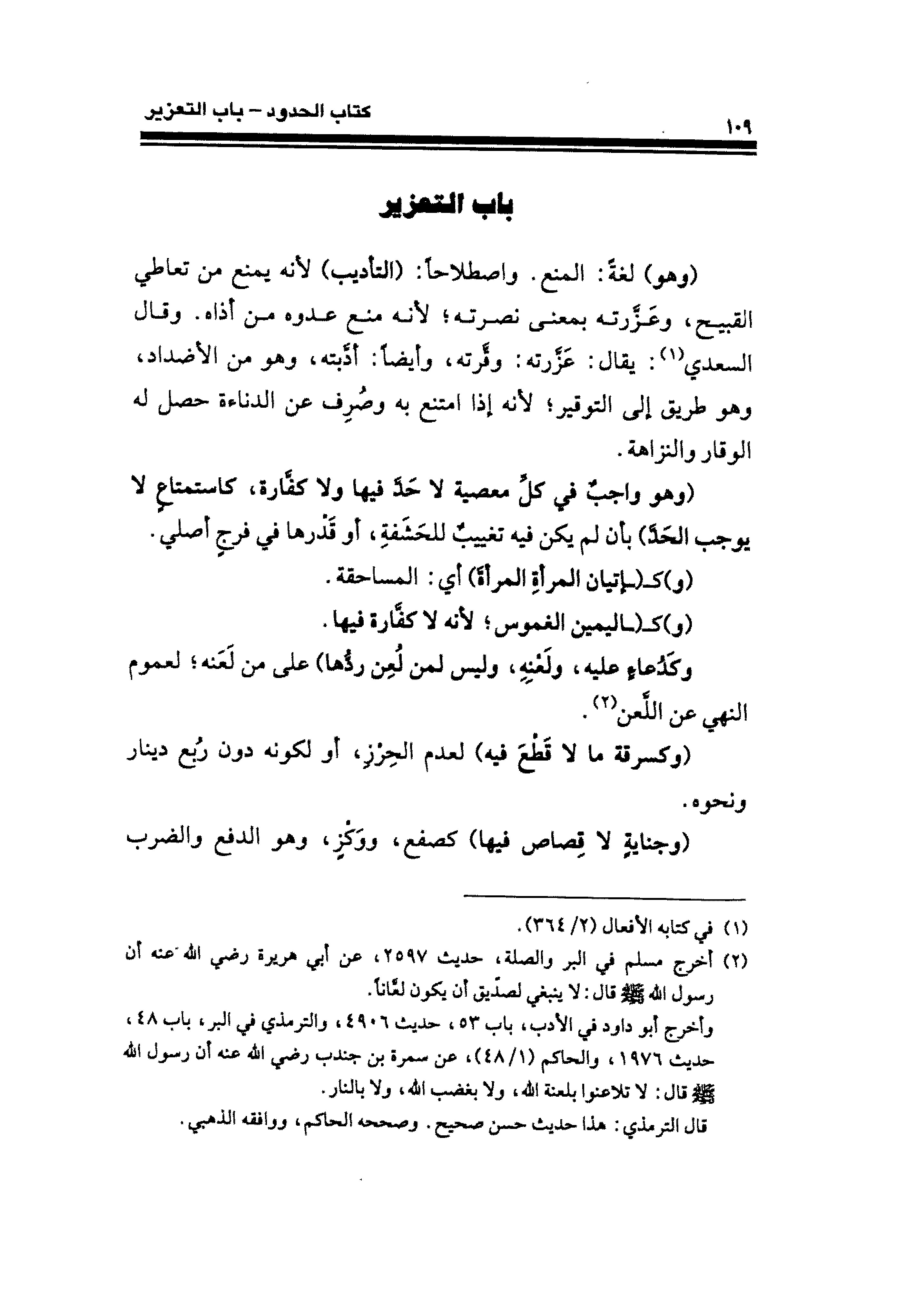 (وهو) لغةً: المنع. واصطلاحًا: (التأديب) لأنه يمنع من تعاطي القبيح، وعَزَّرته بمعنى نصرته؛ لأنه منع عدوه من أذاه. وقال السعدي (¬١): يقال: عَزَّرته: وقَّرته، وأيضًا: أدَّبته، وهو من الأضداد، وهو طريق إلى التوقير؛ لأنه إذا امتنع به وصُرِف عن الدناءة حصل له الوقار والنزاهة.