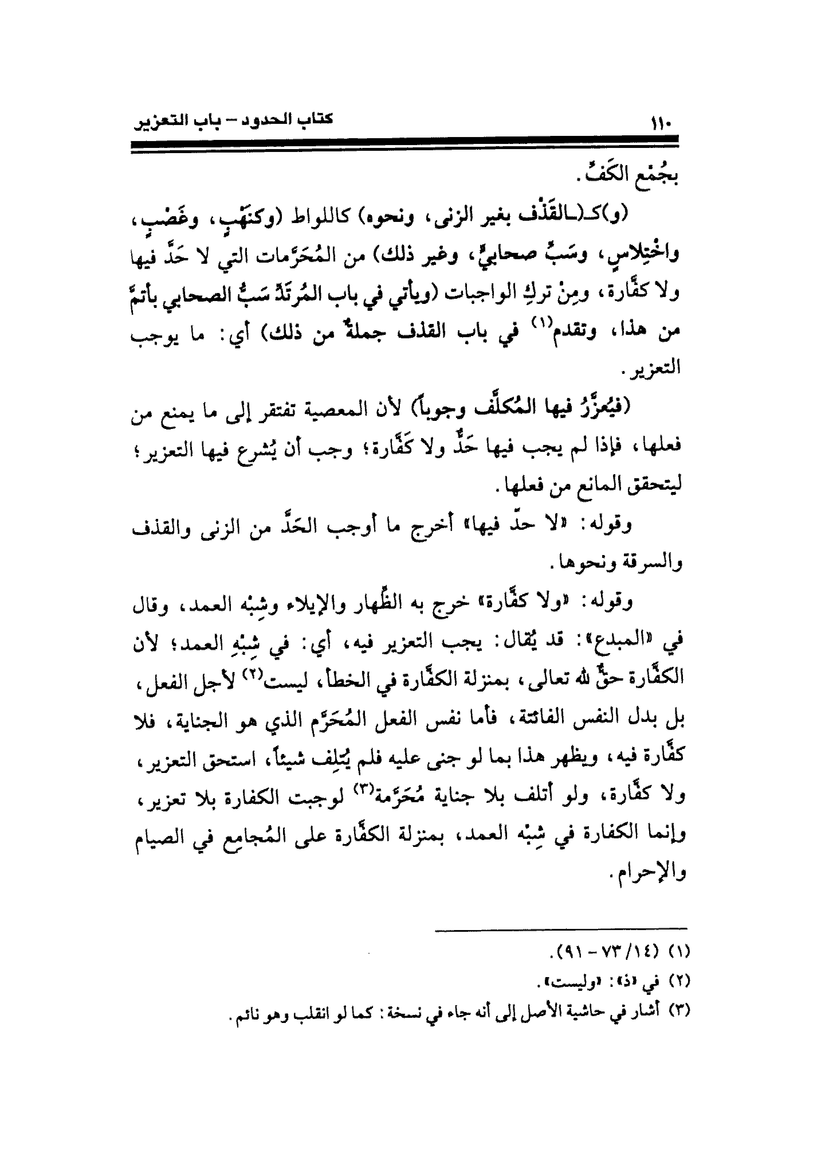 وقوله: "ولا كفَّارة" خرج به الظِّهار والإيلاء وشِبْه العمد، وقال في "المبدع": قد يُقال: يجب التعزير فيه، أي: في شِبْهِ العمد؛ لأنَّ الكفَّارة حقٌّ لله تعالى، بمنزلة الكفَّارة في الخطأ، ليست (¬٢) لأجل الفعل، بل بدل النفس الفائتة، فأما نفس الفعل المُحَرَّم الذي هو الجناية، فلا كفَّارة فيه، ويظهر هذا بما لو جنى عليه فلم يُتلِف شيئًا، استحق التعزير، ولا كفَّارة، ولو أتلف بلا جناية مُحَرَّمة (¬٣) لوجبت الكفارة بلا تعزير، وإنما الكفارة في شِبْه العمد، بمنزلة الكفَّارة على المُجامِع في الصيام والإحرام.
