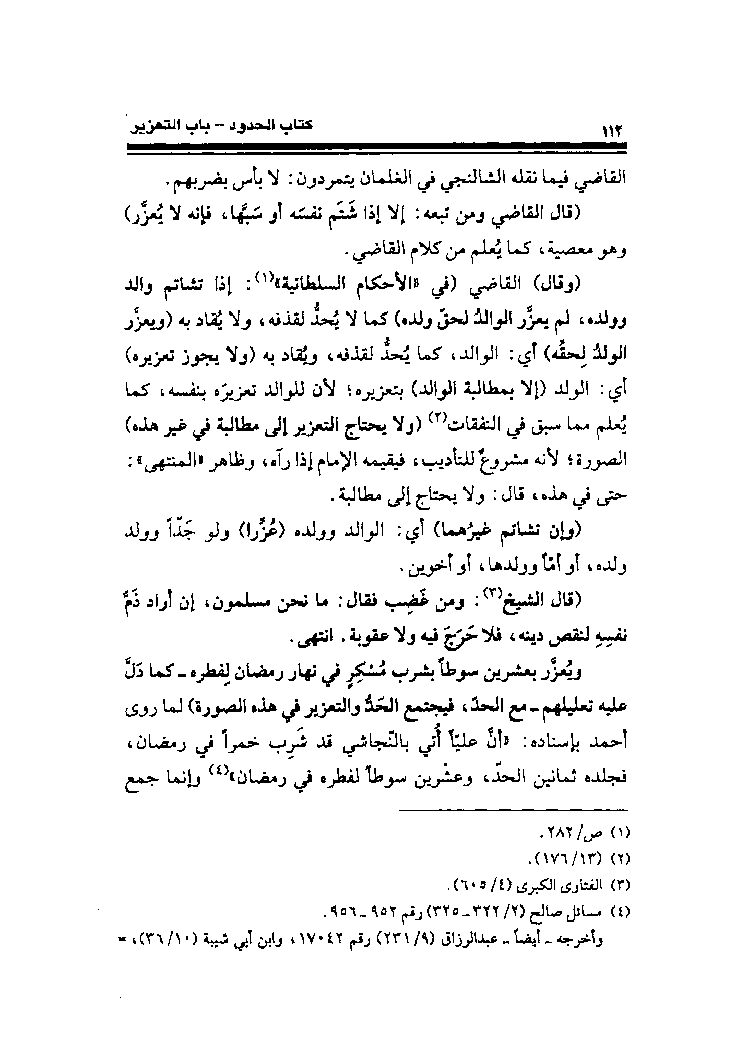 (وقال) القاضي (في "الأحكام السلطانية" (¬١): إذا تشاتم والد وولده، لم يعزَّر الوالدُ لحق ولده) كما لا يُحدُّ لقذفه، ولا يُقاد به (ويعزَّر الولدُ لِحقِّه) أي: الوالد، كما يُحدُّ لقذفه، ويُقاد به (ولا يجوز تعزيره) أي: الولد (إلا بمطالبة الوالد) بتعزيره؛ لأنَّ للوالد تعزيرَه بنفسه، كما يُعلم مما سبق في النفقات (¬٢) (ولا يحتاج التعزير إلى مطالبة في غير هذه) الصورة؛ لأنه مشروعٌ للتأديب، فيقيمه الإمام إذا رآه، وظاهر "المنتهى": حتى في هذه، قال: ولا يحتاج إلى مطالبة.