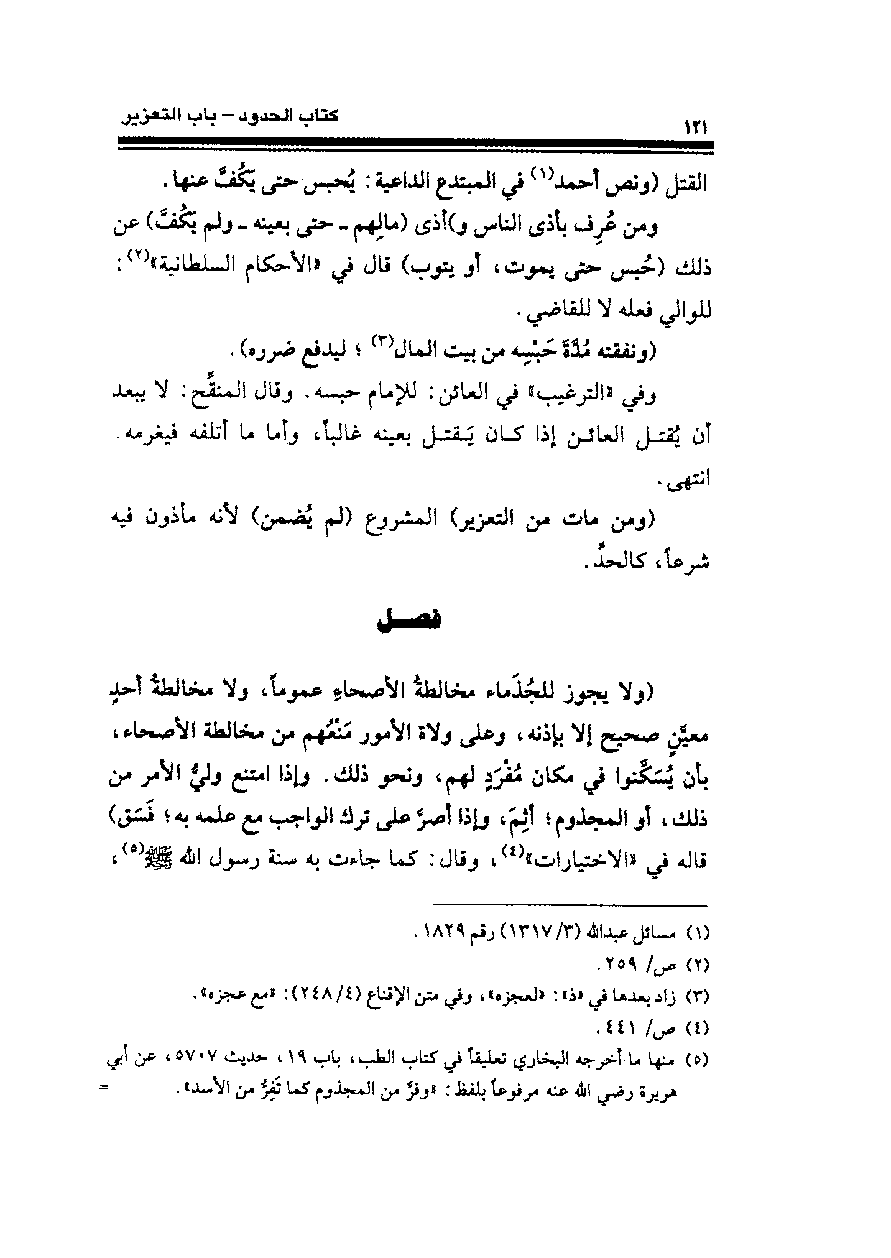 (ولا يجوز للجُذَماء مخالطةُ الأصحاءِ عمومًا، ولا مخالطةُ أحدٍ معيَّنٍ صحيح إلا بإذنه، وعلى ولاة الأمور مَنْعُهم من مخالطة الأصحاء، بأن يُسَكَّنوا في مكان مُفْرَدٍ لهم، ونحو ذلك. وإذا امتنع وليُّ الأمر من ذلك، أو المجذوم؛ أثِمَ، وإذا أصرَّ على ترك الواجب مع علمه به؛ فَسَق) قاله في "الاختيارات" (¬٤)، وقال: كما جاءت به سنة رسول الله - صلى الله عليه وسلم - (¬٥)،