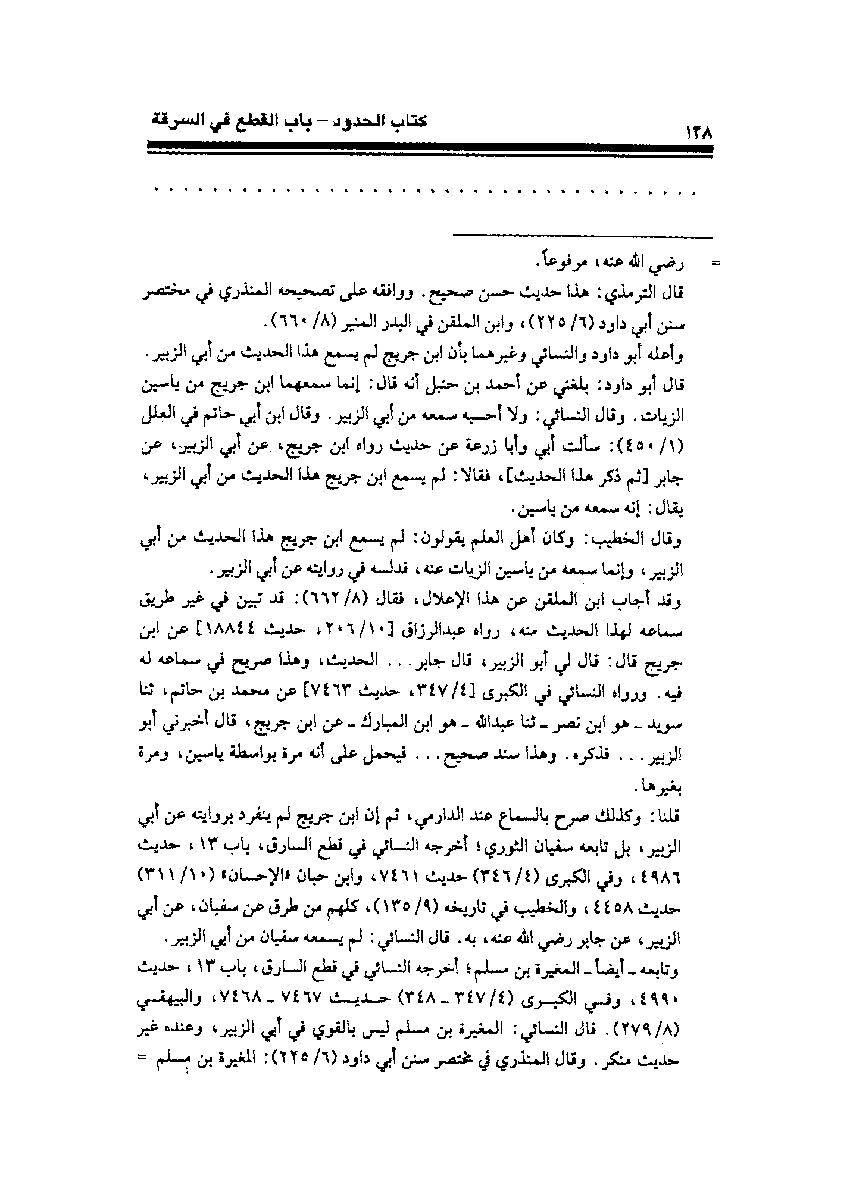 قلنا: وكذلك صرح بالسماع عند الدارمي، ثم إن ابن جريج لم ينفرد بروايته عن أبي الزبير، بل تابعه سفيان الثوري؛ أخرجه النسائي في قطع السارق، باب ١٣، حديث ٤٩٨٦، وفي الكبرى (٤/ ٣٤٦) حديث ٧٤٦١، وابن حبان "الإحسان" (١٠/ ٣١١) حديث ٤٤٥٨، والخطيب في تاريخه (٩/ ١٣٥)، كلهم من طرق عن سفيان، عن أبي الزبير، عن جابر رضي الله عنه، به. قال النسائي: لم يسمعه سفيان من أبي الزبير.