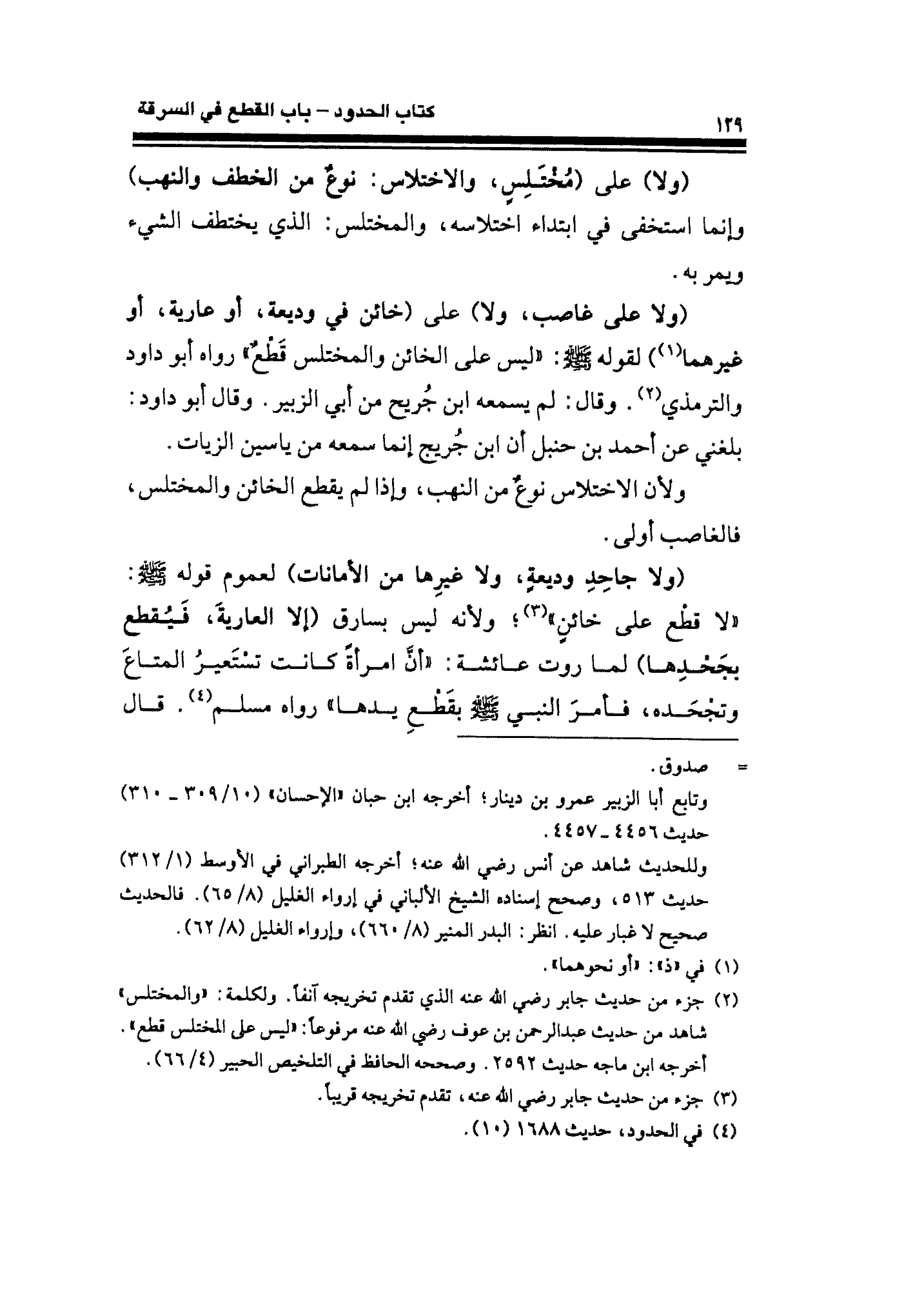 (¬٢) جزء من حديث جابر رضي الله عنه الذي تقدم تخريجه آنفًا. ولكلمة: "والمختلس" شاهد من حديث عبد الرحمن بن عوف رضي الله عنه مرفوعًا: "ليس على المختلس قطع". أخرجه ابن ماجه حديث ٢٥٩٢. وصححه الحافظ في التلخيص الحبير (٤/ ٦٦).