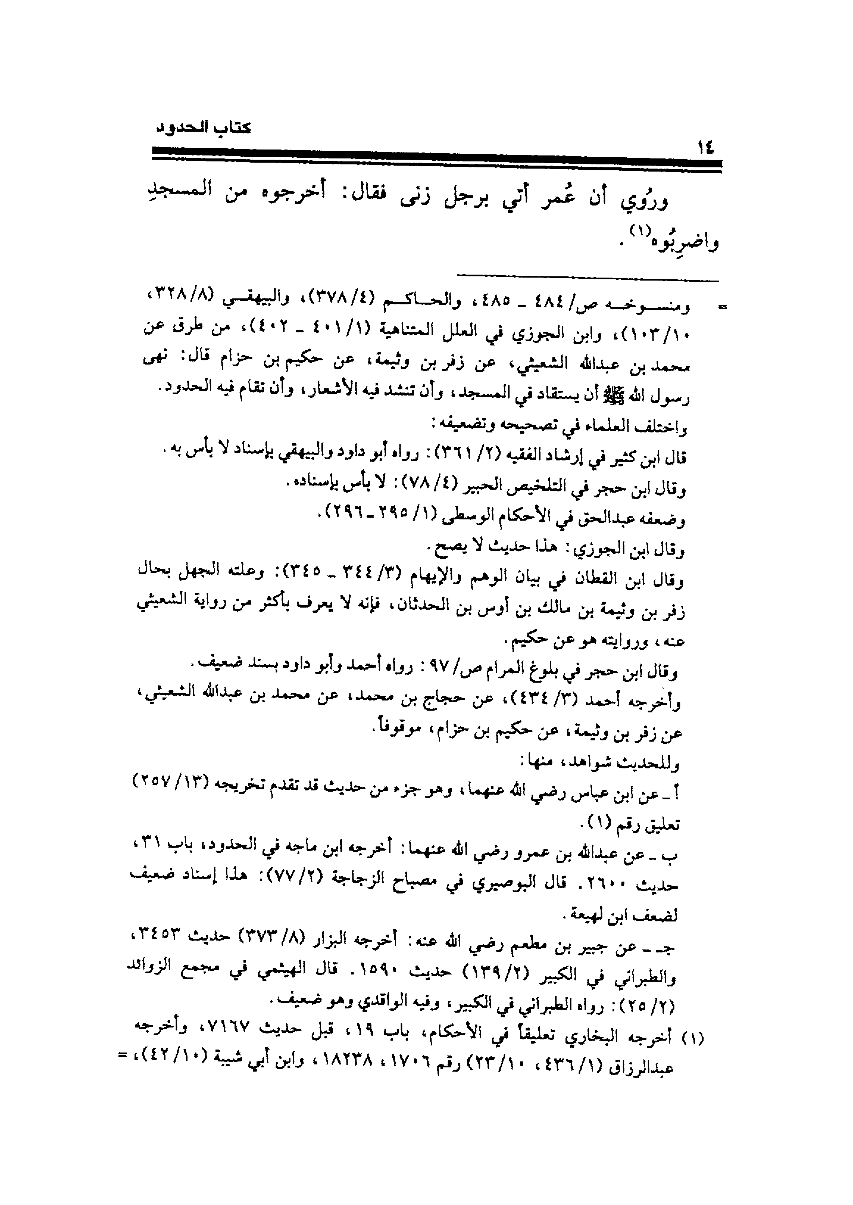 = ومنسوخه ص / ٤٨٤ - ٤٨٥، والحاكم (٤/ ٣٧٨)، والبيهقي (٨/ ٣٢٨)، ١٠/ ١٠٣)، وابن الجوزي في العلل المتناهية (١/ ٤٠١ - ٤٠٢)، من طرق عن محمد بن عبد الله الشعيثي، عن زفر بن وثيمة، عن حكيم بن حزام قال: نهى رسول الله - صلى الله عليه وسلم - أن يستقاد في المسجد، وأن تنشد فيه الأشعار، وأن تقام فيه الحدود.