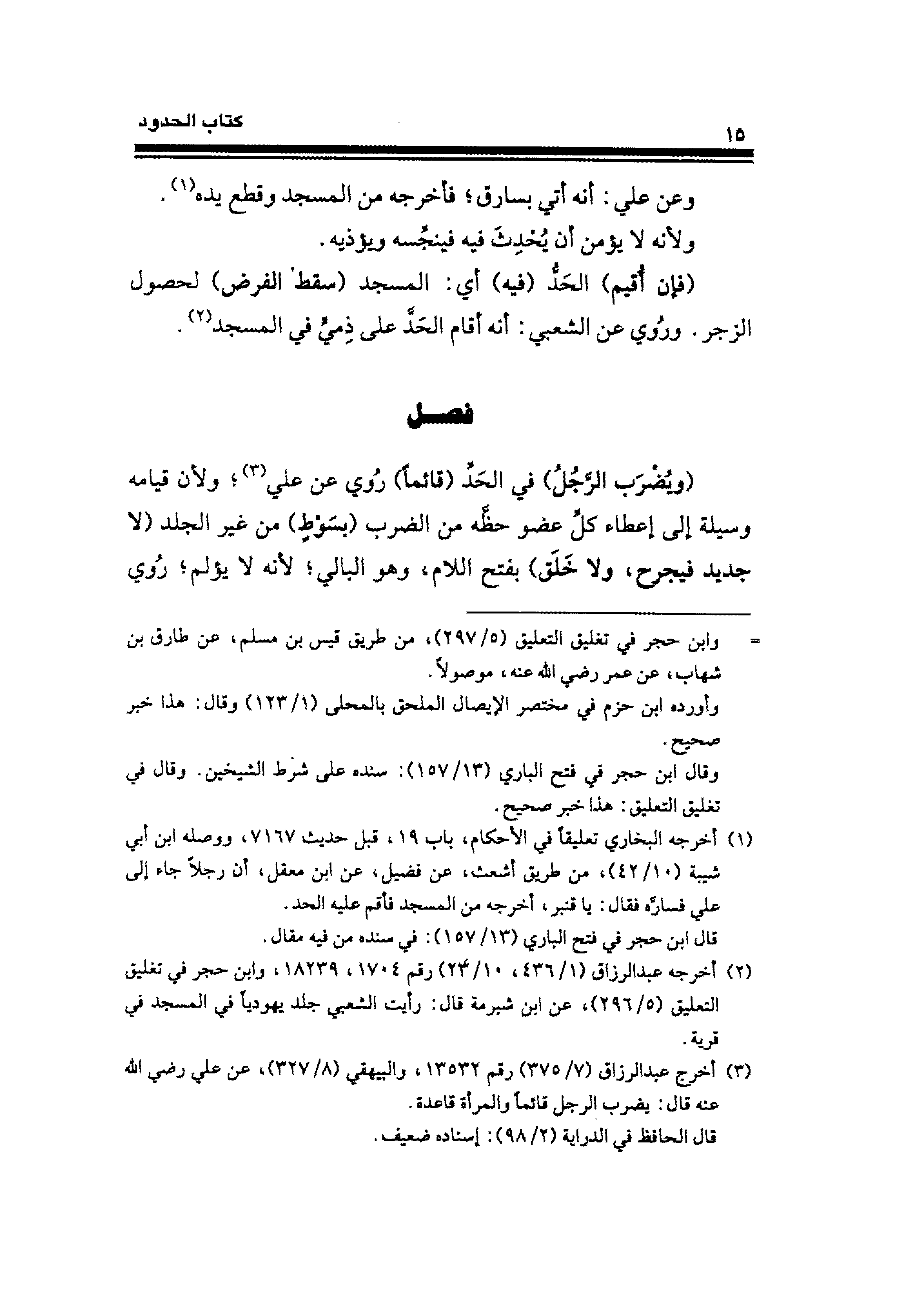 (¬٢) أخرجه عبد الرزاق (١/ ٤٣٦، ١٠/ ٢٣) رقم ١٧٠٤، ٨٢٣٩؛، وابن حجر في تغليق التعليق (٥/ ٢٩٦)، عن ابن شبرمة قال: رأيت الشعبي جلد يهوديًّا في المسجد في قرية.