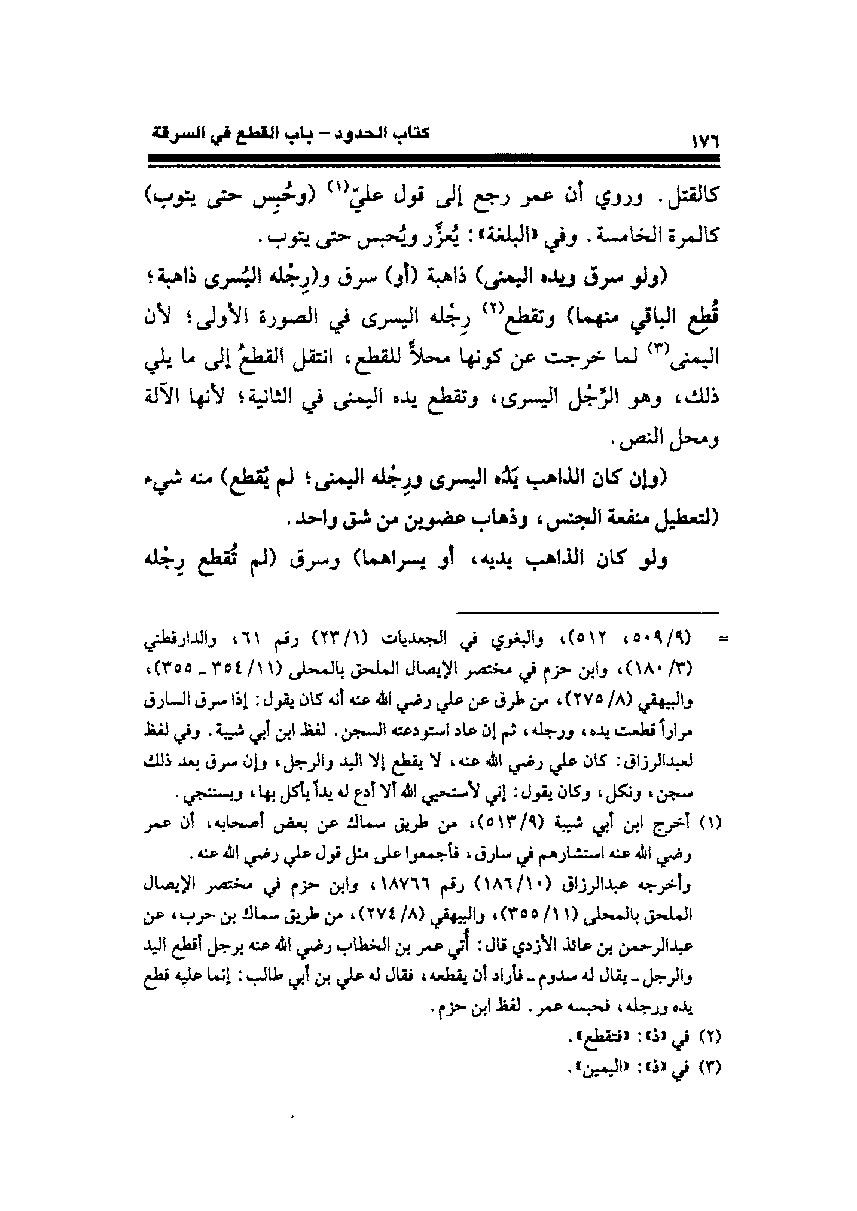 = (٩/ ٥٠٩، ٥١٢)، والبغوي في الجعديات (١/ ٢٣) رقم ٦١، والدارقطني (٣/ ١٨٠)، وابن حزم في مختصر الإيصال الملحق بالمحلى (١١/ ٣٥٤ - ٣٥٥)، والبيهقي (٨/ ٢٧٥)، من طرق عن علي رضي الله عنه أنه كان يقول: إذا سرق السارق مرارًا قطعت يده، ورجله، ثم إن عاد استودعته السجن. لفظ ابن أبي شيبة. وفي لفظ لعبد الرزاق: كان علي رضي الله عنه، لا يقطع إلا اليد والرجل، وإن سرق بعد ذلك سجن، ونكل، وكان يقول: إني لأستحيي الله ألا أدع له يدًا يأكل بها، ويستنجي.