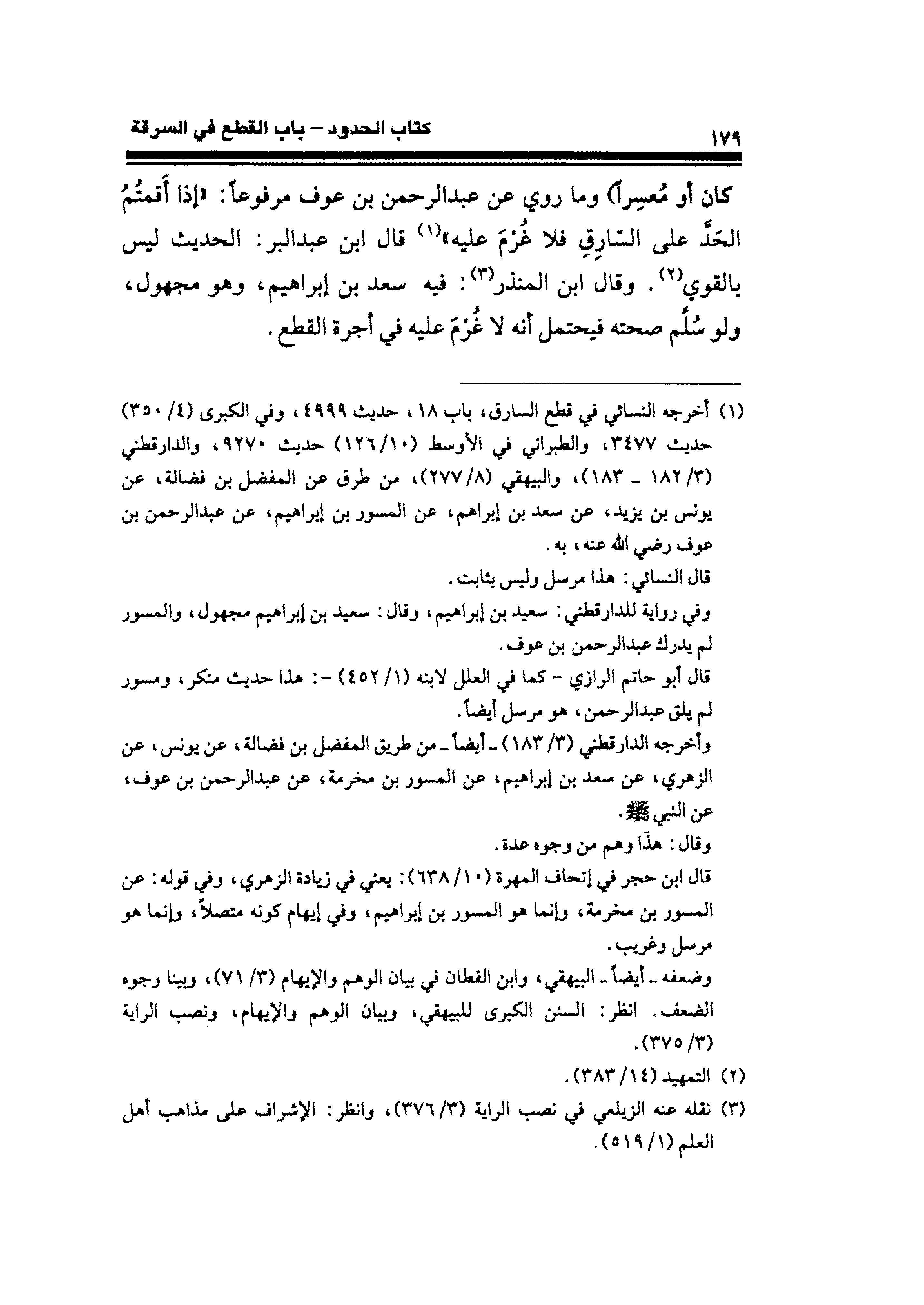 (¬١) أخرجه النسائي في قطع السارق، باب ١٨، حديث ٤٩٩٩، وفي الكبرى (٤/ ٣٥٠) حديث ٣٤٧٧، والطبراني في الأوسط (١٠/ ١٢٦) حديث ٩٢٧٠، والدارقطني (٣/ ١٨٢ - ١٨٣)، والبيهقي (٨/ ٢٧٧)، من طرق عن المفضل بن فضالة، عن يونس بن يزيد، عن سعد بن إبراهم، عن المسور بن إبراهيم، عن عبد الرحمن بن عوف رضي الله عنه، به،