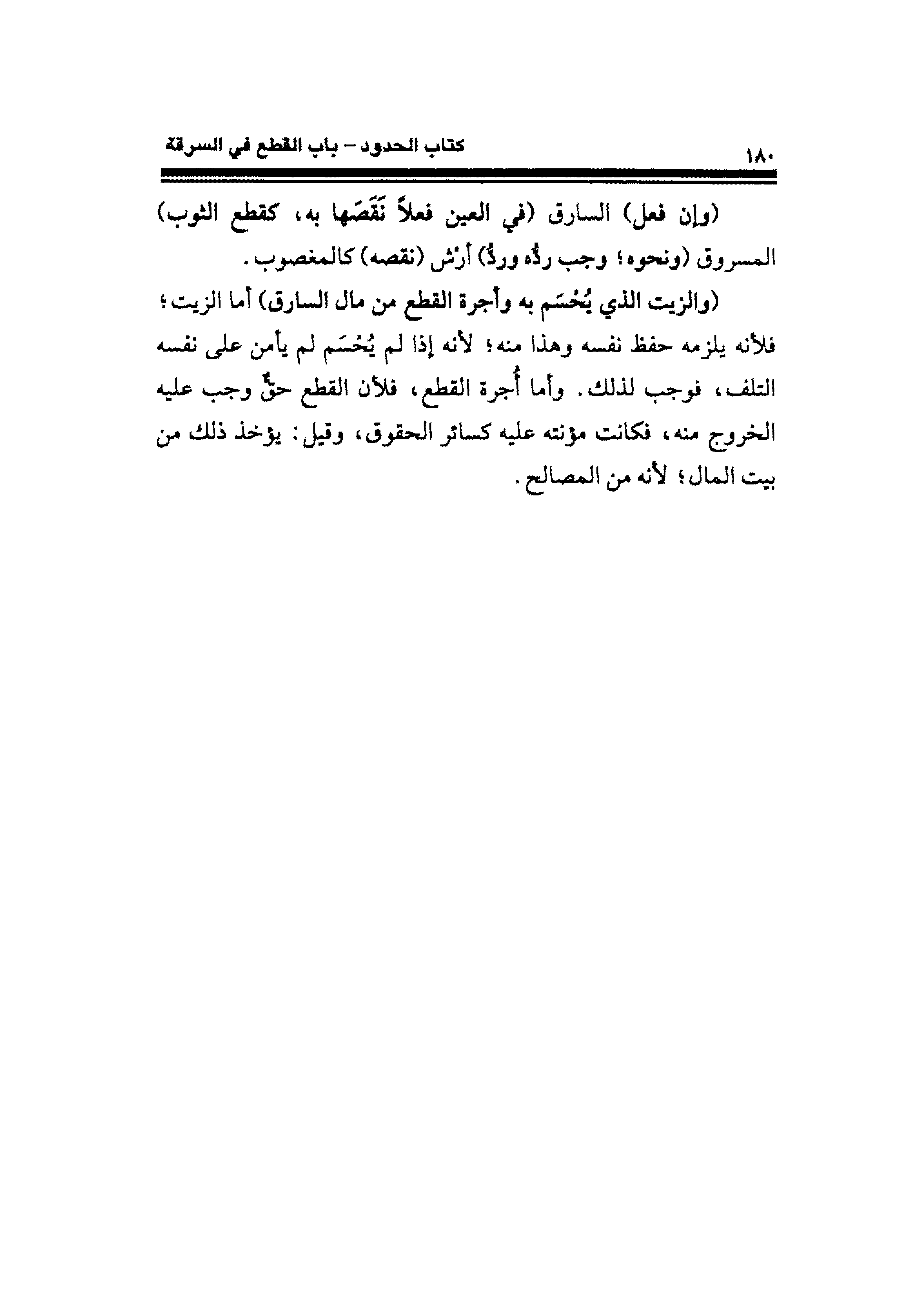 (والزيت الذي يُحْسَم به وأجرة القطع من مال السارق) أما الزيت؛ فلأنه يلزمه حفظ نفسه وهذا منه؛ لأنه إذا لم يُحْسَم لم يأمن على نفسه التلف، فوجب لذلك. وأما أُجرة القطع، فلأن القطع حقُّ وجب عليه الخروج منه، فكانت مؤنته عليه كسائر الحقوق، وقبل: يؤخذ ذلك من بيت المال؛ لأنه من المصالح.