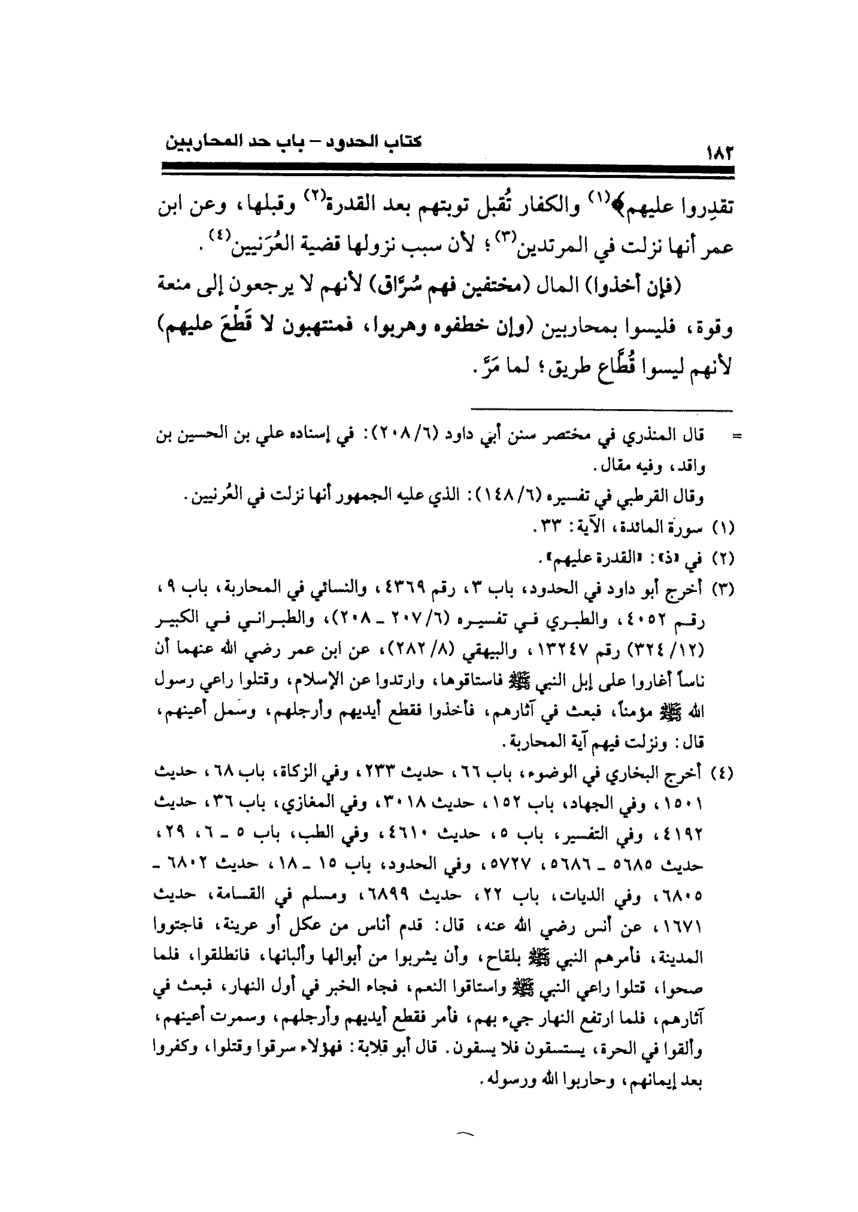 (¬٤) أخرج البخاري في الوضوء، باب ٦٦، حديث ٢٣٣، وفي الزكاة، باب ٦٨، حديث ١٥٠١، وفي الجهاد، باب ١٥٢، حديث ٣٠١٨، وفي المغازي، باب ٣٦، حديث ٤١٩٢، وفي التفسير، باب ٥، حديث ٤٦١٠، وفي الطب، باب ٥ - ٦، ٢٩، حديث ٥٦٨٥ - ٥٦٨٦، ٥٧٢٧، وفي الحدود، باب ١٥ - ١٨، حديث ٦٨٠٢ - ٦٨٠٥، وفي الديات، باب ٢٢، حديث ٦٨٩٩، ومسلم في القسامة، حديث ١٦٧١، عن أنس رضي الله عنه، قال: قدم أناس من عكل أو عرينة، فاجتووا المدينة، فأمرهم النبي - صلى الله عليه وسلم - بلقاح، وأن يشربوا من أبوالها وألبانها، فانطلقوا، فلما صحوا، قتلوا راعي النبي - صلى الله عليه وسلم - واستاقوا النعم، فجاء الخبر في أول النهار، فبعث في آثارهم، فلما ارتفع النهار جيء بهم، فأمر فقطع أيديهم وأرجلهم، وسمرت أعينهم، وألقوا في الحرة، يستقون فلا يسقون. قال أبو قلابة: فهؤلاء سرقوا وقتلوا، وكفروا بعد إيمانهم، وحاربوا الله ورسوله.