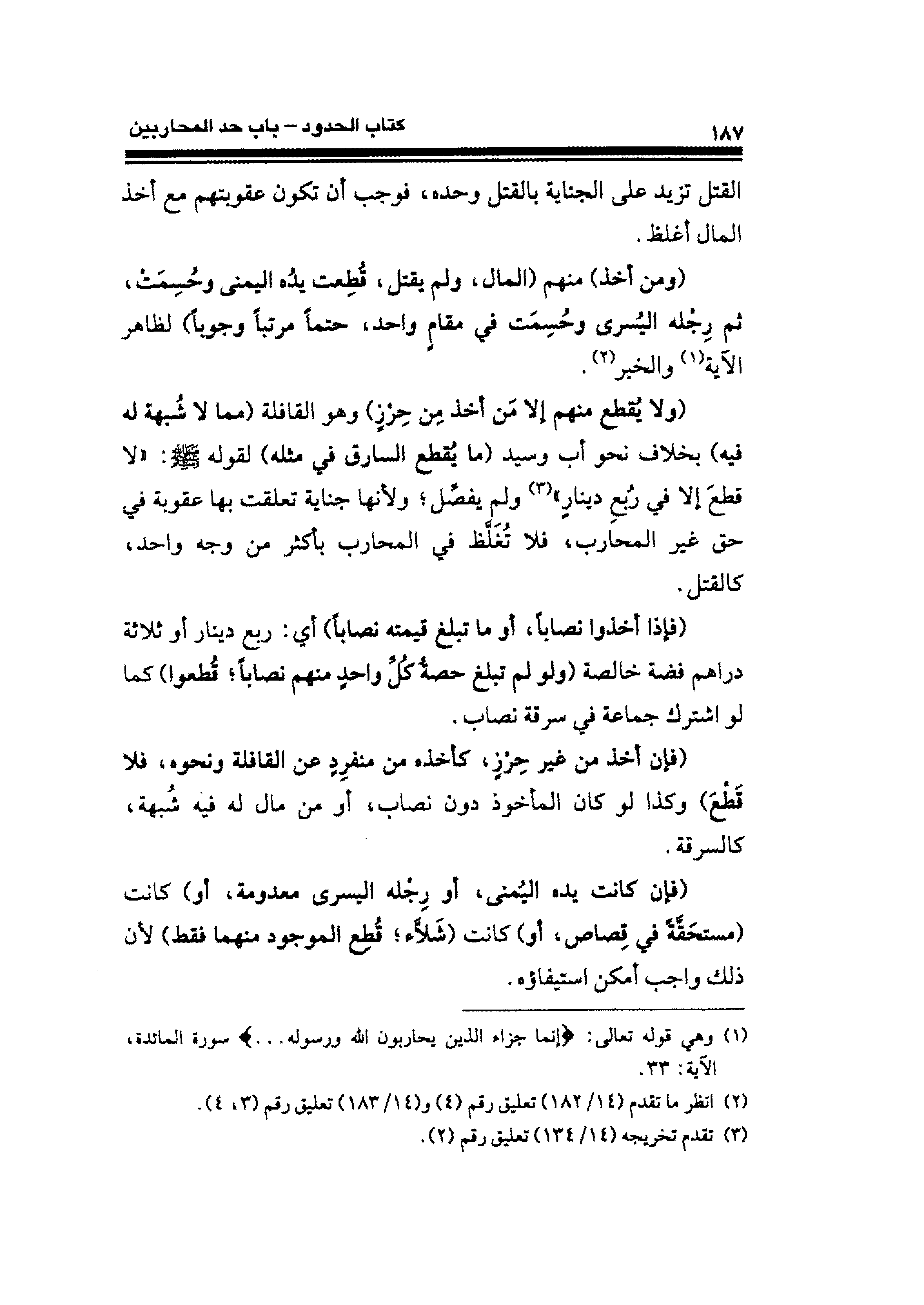 (¬١) وهي قولهُ تعالى: {إِنَّمَا جَزَاءُ الَّذِينَ يُحَارِبُونَ اللَّهَ وَرَسُولَهُ ... } سورة المائدة، الآية: ٣٣.