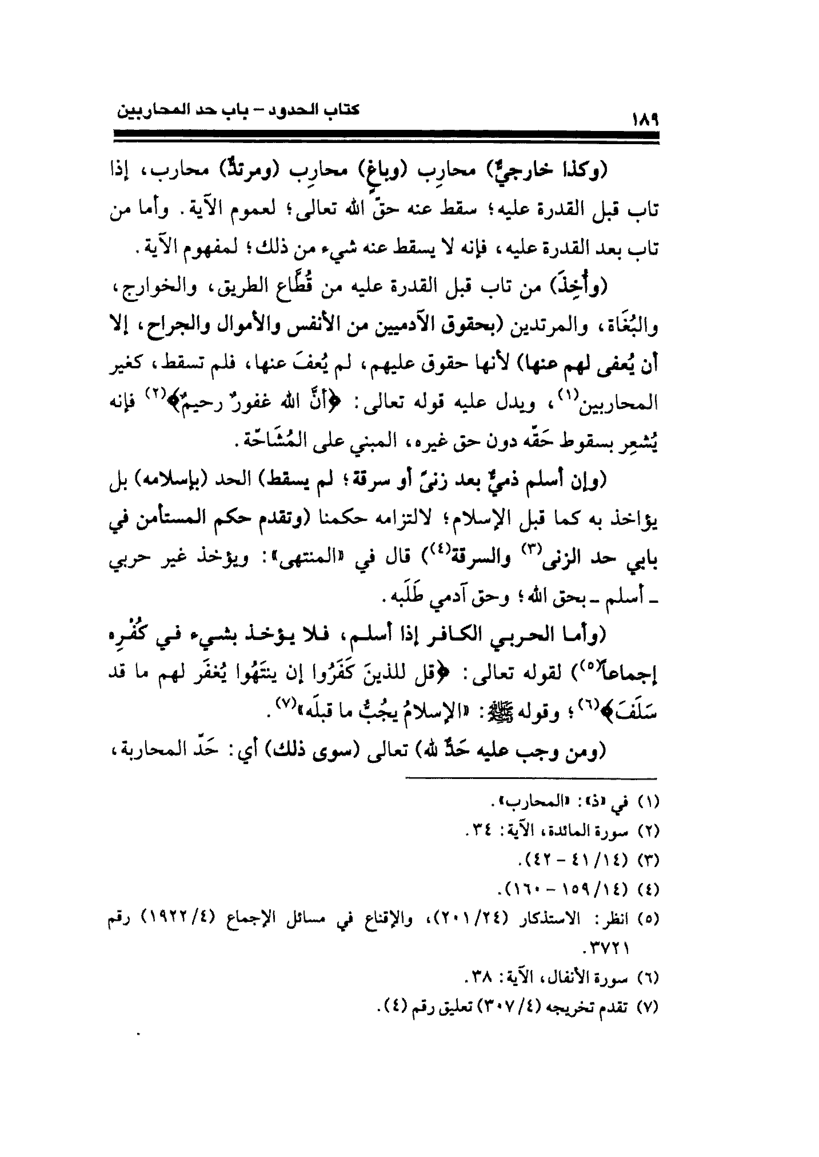 (وكذا خارجيٌّ) محارِب (وباغٍ) محارب (ومرتد) محارب، إذا تاب قبل القدرة عليه؛ سقط عنه حق الله تعالى؛ لعموم الآية. وأما من تاب بعد القدرة عليه، فإنه لايسقط عنه شيء من ذلك؛ لمفهوم الآية.