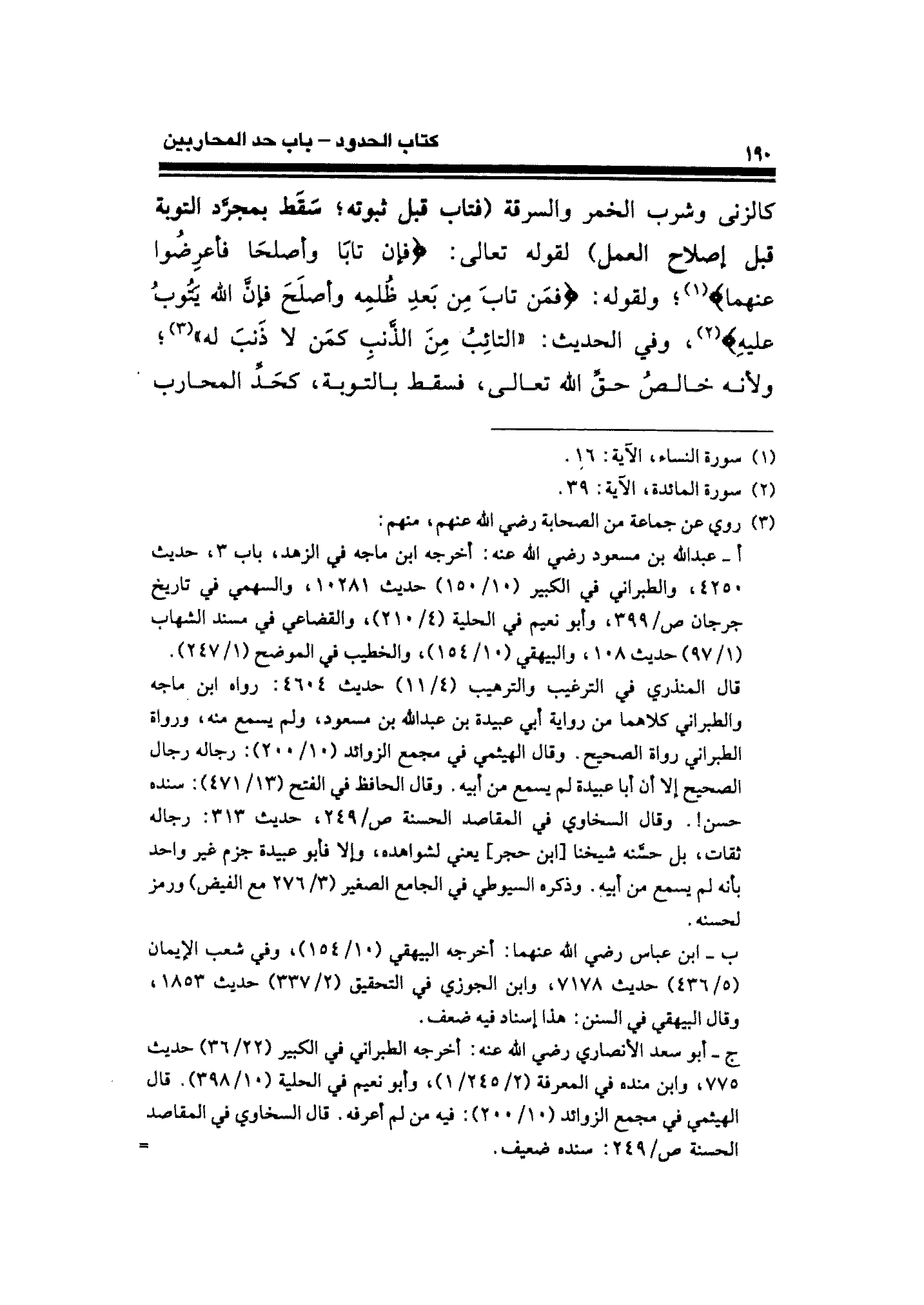 كالزني وشرب الخمر والسرقة (فتاب قبل ثبوته؛ سَقَط بمجرد التوبة قبل إصلاح العمل) لقوله تعالى: {فإن تابا وأصلحَا فأعرِضوا عنهما} (¬١)؛ ولقوله: {فمن تابَ مِن بَعدِ ظُلمِه وأصلَحَ فإن الله يتوبُ عليهِ} (¬٢)، وفي الحديث: "التائِبُ مِنَ الذنبِ كمَن لا ذَنبَ له" (¬٣)؛ ولأنه خالصُ حقِّ الله تعالى، فسقط بالتوبة، كحَد المحارب