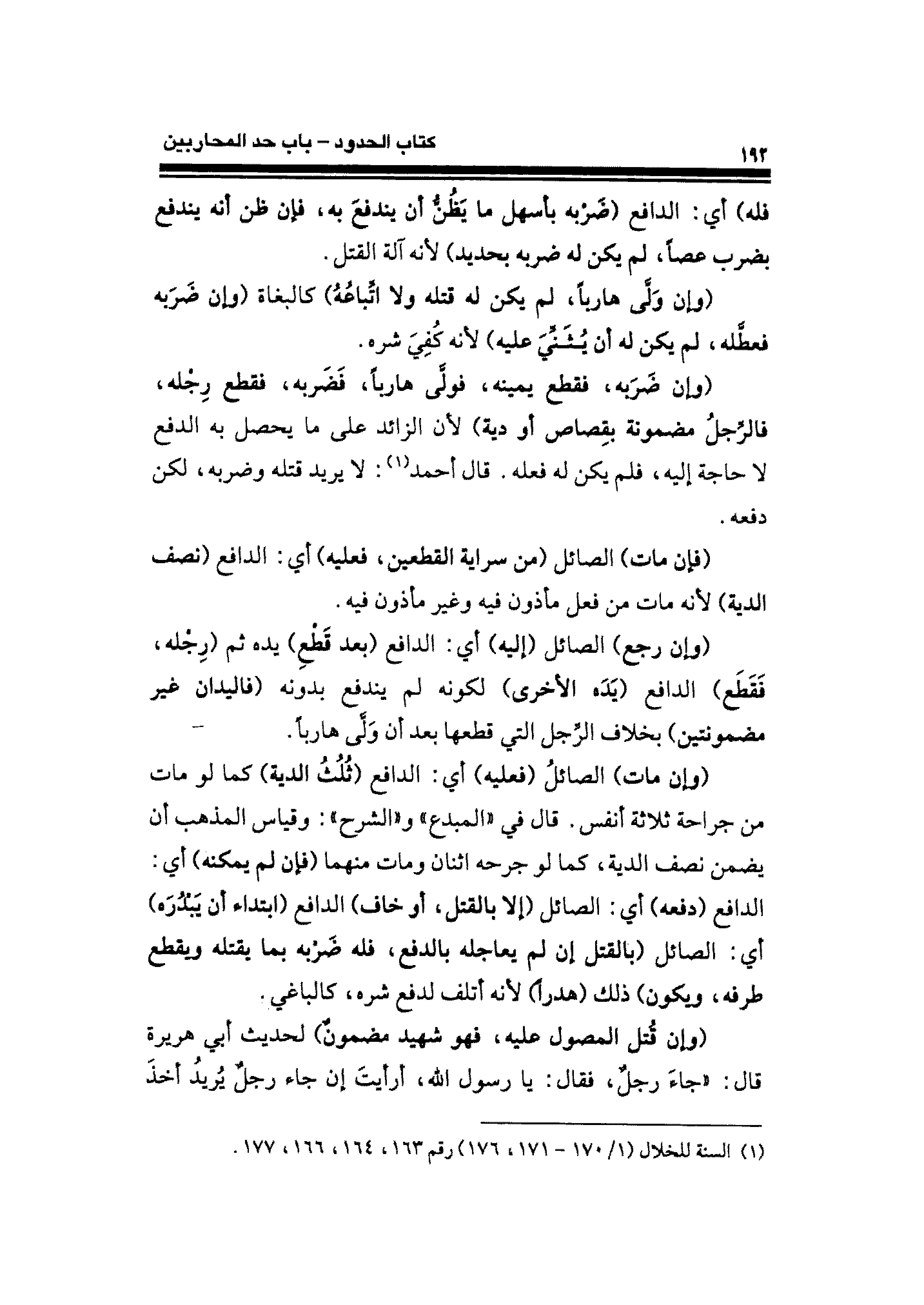 (وإن مات) الصائلُ (فعليه) أي: الدافع (ثُلُثُ الدية) كما لو مات من جراحة ثلاثة أنفس. قال في "المبدع" و"الشرح": وقياس المذهب أن يضمن نصف الدية، كما لو جرحه اثنان ومات منهما (فإن لم يمكنه) أي: الدافع (دفعه) أي: الصائل (إلا بالقتل، أو خاف) الدافع (ابتداء أن يَبدرَه) أي: الصائل (بالقتل إن لم يعاجله بالدفع، فله ضَرْبه بما يقتله ويقطع طرفه، ويكون) ذلك (هدرًا) لأنه أتلف لدفع شره، كالباغي.